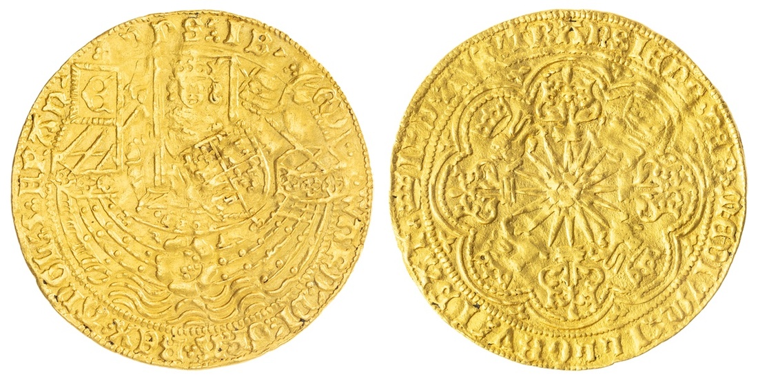Edward IV, First Reign (1461-1470), Flemish Imitation Rose Noble or Ryal, c. 1585, Gorinchem, trefoil stops, king standing in ship, holding sword and shield, E on standard beside, rev. trefoil stops, rose-atop radiant sun over floriated cross, crowns and leopards in angles, trefoils in spandrels, 7.55g, 8h, i.m. crown (Schneider I, 842; North 1549; S.1952), small areas of softness, on a pleasingly full flan, very fine