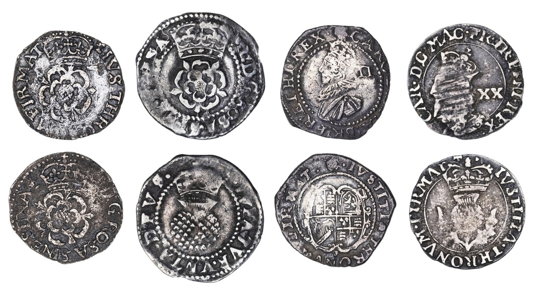 James I (1603-1625), Second Coinage, Halfgroat, 1604-1605, Tower, crowned rose, rev. crowned thistle, 0.95g, 3h, m.m. lys (North 2105/1; S.2660), uniform dark tone, about very fine; Charles I (1625-1660), Group A, Type 1a, Halfgroat, 1626-1627, Tower (under King), crowned rose, rev. crowned rose, no inner circles, 0.92g, 5h, m.m. head (North 2249; S.2823), pitted surfaces, bolder fine; Group C, Halfgroat, 1631-1632, Tower (under King), third crowned and draped bust left, value behind, rev. oval garnished shield, 1.05g, 1h, m.m. rose (North 2252; S.2826), about very fine; Scotland, Charles I (1625-1649), Third Coinage, Falconer's First Issue, Twenty-Pence, crowned and draped bust left, value behind, rev. crowned thistle, 0.67g, 10h, m.m. F [on reverse only] (S.5588), scratched to portrait, fine (4)