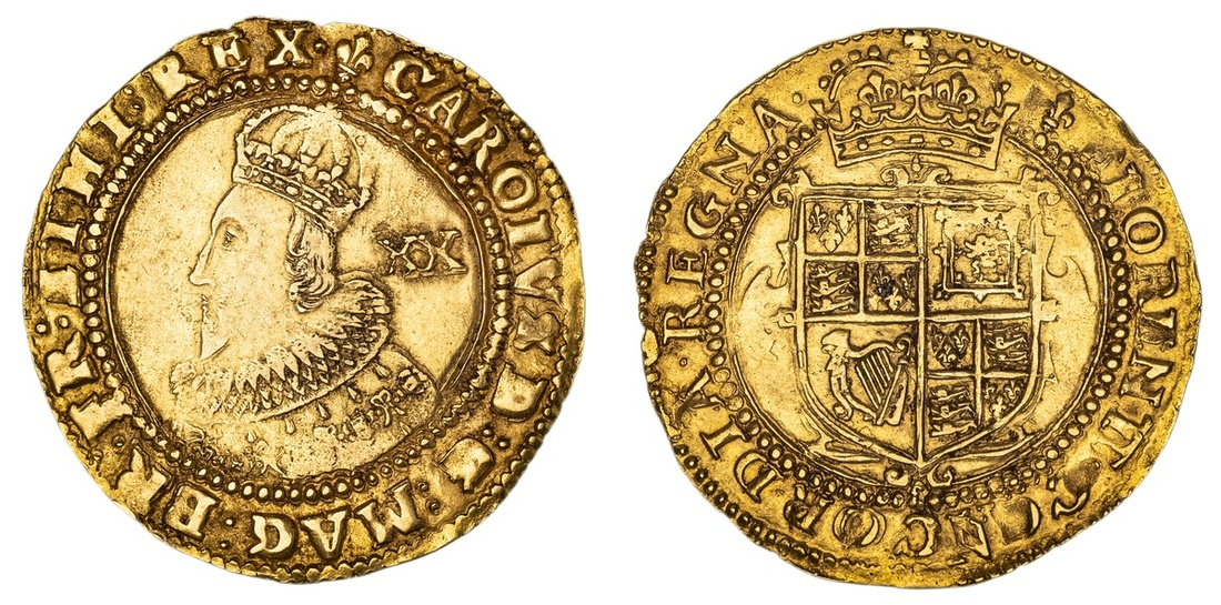 Charles I (1625-1649), Group A, Class II, Unite, 7 July 1625 - 29 June 1626, Tower (under King), (m.m.) CAROLVS D : G : MAG : BR : FR : ET HI : REX •, double-arched first-crowned 'Coronation' bust 1 left, wearing ruff, XX behind, rev. (m.m.) FLORENT • CONCORDIA • REGNA •, crowned square-topped shield with elaborate garnishing, bird-headed harp with six strings, 9.07g, 3h, m.m. lys (Brooker 24; Schneider II, 114-115; North 2146; S.2685), softness to the portrait and garnishing, otherwise with hint of golden toning, about very fine