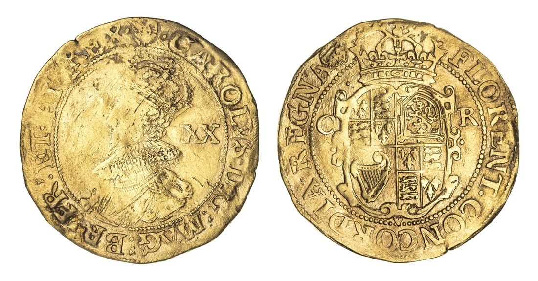 Charles I (1625-1649), Group C, Class IIa, Unite, 23 June 1631- 21 June 1632, Tower (under King), (m.m.) • CAROLVS • D .' G .' MAG .' BR .' FR .' ET • HI .' REX •, third crowned and draped bust left, value behind, rev. FLORENT • CONCORDIA • REGNA (m.m.), crowned and garnished shield, dividing C-R, harp with seven strings, 8.87g, 8h, m.m. rose over plume (Schneider II, 140; North 2754; S.2690), heavily cleaned and with some tooling marks, otherwise to a relatively pleasing round flan, fine