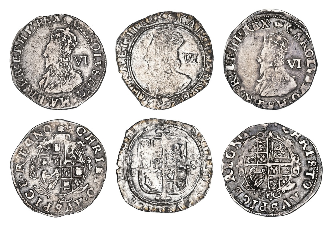 Charles I (1625-1649), Group D, Type 3a, Sixpence, 1636-1638, Tower (under King), small fourth crowned bust left, with falling lace collar, no inner circles, rev. oval garnished shield, no inner circles, 2.89g, 9h, m.m. tun (North 2241; S.2813), softly struck to the portrait, partially clipped, pleasing to the obverse mint mark, nearing very fine; another, as before, 3.00g, 7h, m.m. crown (North 2241; S.2813), soft in parts, pleasing to the collar, about very fine; another, Group F, Type 4.3, Sixpence, 1641-1643, Tower (under King), sixth 'Briot's' bust left, rev. square-topped shield over cross moline, 3.18g, 7h, m.m. triangle in circle (North 2246; S.2817), clipped and mostly soft to portrait, bolder fine (3)