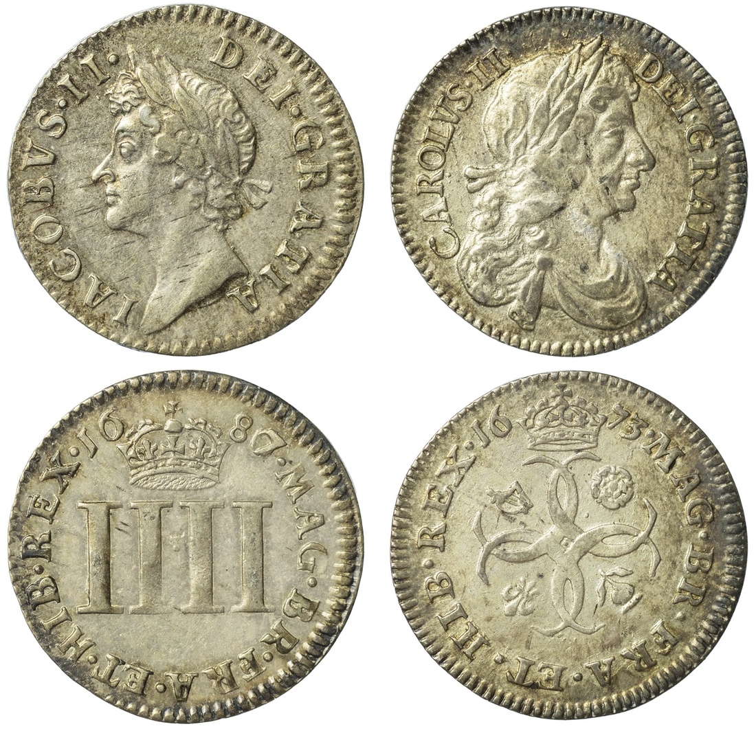 Milled Silver (2) | Charles II (1660-1685), Second Milled Issue, Fourpence, 1673, plain edge, 1.98g, 6h (ESC 1844; Bull 611 [S]; S.3384); also, James II (1685-1688), Maundy Fourpence, 1687/6, plain edge, 2.11g, 6h (ESC 1862; Bull 786; S.3414), both good very fine (2)