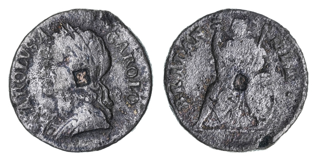 Charles II (1660-1685), Tin Farthing, with copper plug, 1684, laureate and cuirassed bust left, rev. Britannia seated left, lettered edge, 5.47g, 6h (S.3395), with lightly corroded surfaces, as common for type, edge largely legible, bolder fine