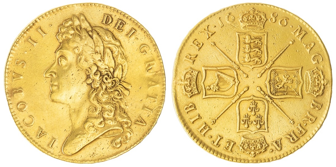 James II (1685-1688), Five-Guineas, 1686 SECVNDO, first small laureate bust left, rev. crowned cruciform shields, sceptres in angles, nine strings to harp, edge upwards lettered, 40.88g, 6h (EGC 310; MCE 116; S.3396), burnished and removed from a swivel mount with repairs at 3 and 9 o'clock, otherwise as struck, details very fine