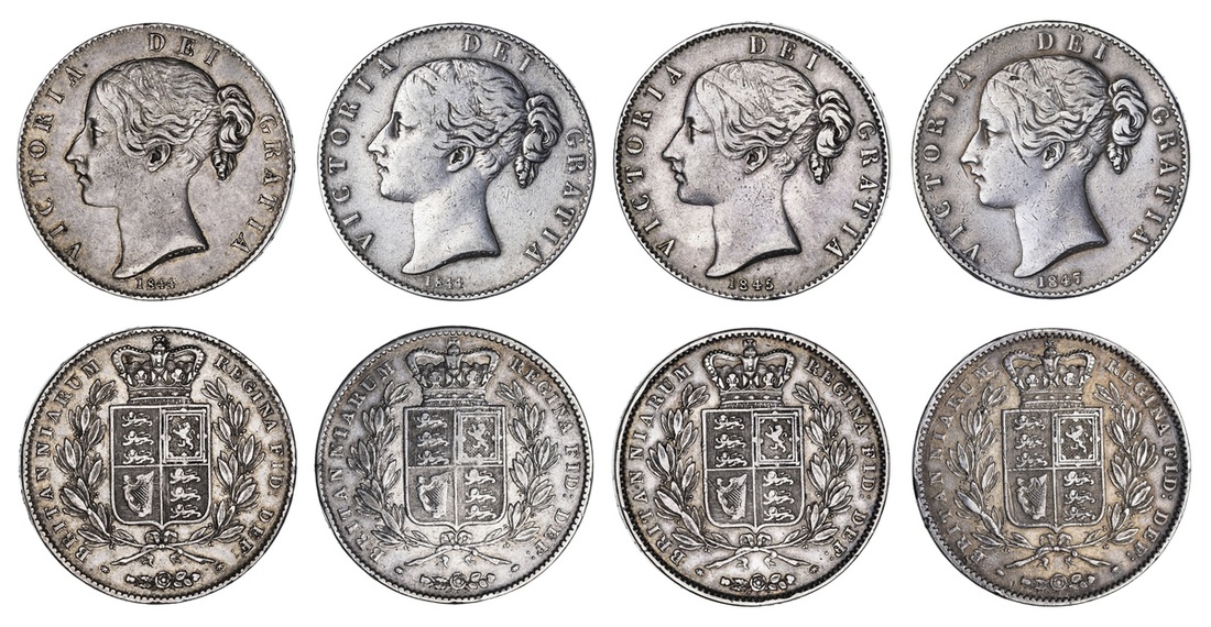 Victoria (1837-1901), 'Young Head' Crown, 1844 VIII, cinquefoil stops, young head left, rev. crowned shield in wreath, incuse downwards lettered edge, 28.06g, 6h (ESC 281; Bull 2562; S.3882), cleaned and lightly bagmarked, about very fine; another, 1844 VIII, star stops, as before, upwards lettered edge, 28.23g, 6h (ESC 280; Bull 2561; S.3882), lightly bagmarked, yet residually lustrous and toned, good very fine; another, 1845 VIII, Crown, as before, downwards lettered edge, 28.19g, 6h (ESC 282; Bull 2564; S.3882), light bagmarking, good very fine; another, 1847 XI, as before, upwards lettered edge, 28.16g, 6h (ESC 286; Bull 2567; S.3882), cleaned and bagmarked, very fine (4)