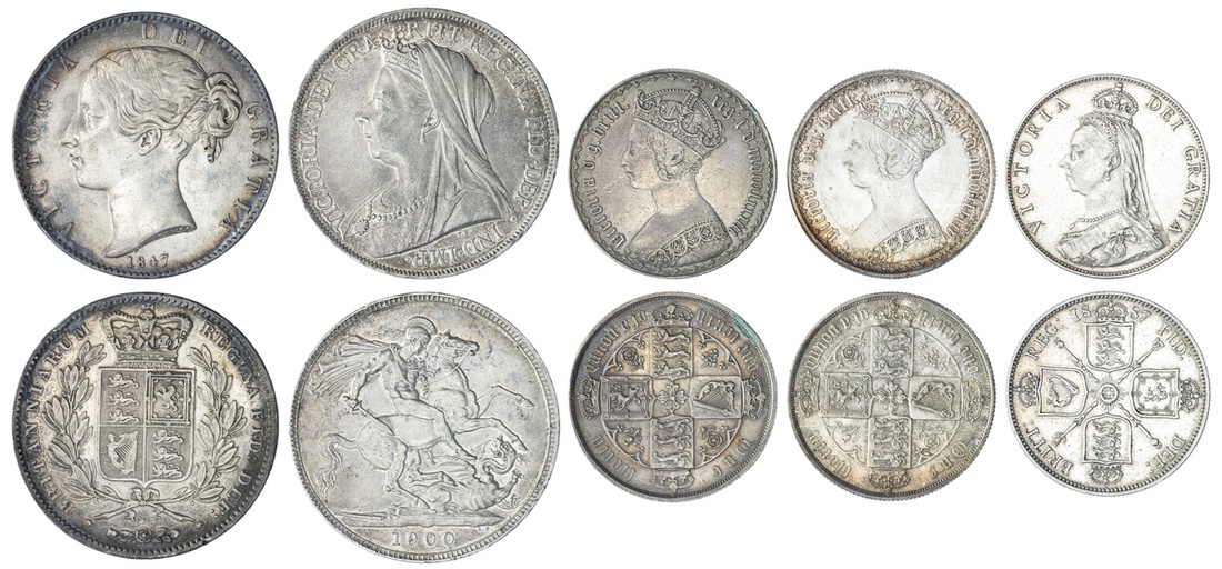 Victoria (1837-1901), 'Young Head' Crown, 1847 XI, cinquefoil stops, young head left, rev. crowned shield in wreath, upwards lettered edge, 28.19g, 6h (ESC 286; Bull 2567; S.3882), wiped and lightly contact marked, nonetheless richly toned to the peripheries, the E of ET missing top serif, very fine; 'Old Head' Crown, 1900 LXIV, veiled bust left, rev. St George and Dragon, upwards lettered edge, 28.29g, 12h (ESC 319; Bull 2609; S.3937), some light contact marks, with a residual lustre, very fine; 'Gothic' Florin, MDCCCLXXIV [1874], Type B8, [Die 13], crowned 'Gothic' bust left, rev. crowned shields cruciform, national emblems in angles, edge milled, 11.31g, 6h (ESC 843; Bull 2881; S.3893), some minor friction marking and die flawed to reverse legends, otherwise lustrous about uncirculated; 'Gothic' Florin, MDCCCLXXXIII [1883], Type E2, crowned 'Gothic' bust left, rev. crowned shields cruciform, national emblems in angles, edge milled, 11.28g, 6h (ESC 859; Bull 2905; S.3900), cleaned and patches of verdigris to edges, very fine; 'Golden Jubilee' Florin, 1887, crowned 'Jubilee' bust left, rev. crowned shields, sceptres in angles, edge milled, 11.26g, 12h (ESC 868; Bull 2953; S.3925), cleaned, about very fine (5)