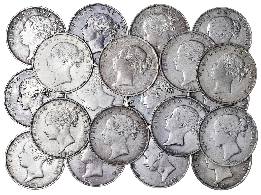 'Young Head' Halfcrowns (20) | Victoria (1837-1901), 'Young Head' Halfcrown, 1840, young head left, rev. crowned shield in wreath, straight milled edge, 13.98g, 6h (ESC 673; Bull 2715; S.3887), cleaned, about very fine; another, 1840, as before, edge milled, 13.97g, 6h (ESC 673; Bull 2715; S.3887), bagmarked and wiped to subsequently toned surfaces, very fine; another, 1844, with serifs, as before, plain to truncation, edge milled, 14.09g, 6h (ESC 677; Bull 2720; S.3888), cleaned and bagmarked, hairline dieflaw to reverse, very fine; another, 1846, as before, edge milled, 13.92g, 6h (ESC 680; Bull 2724; S.3888), bagmarked and cleaned, about very fine; another, 1849, as before, edge milled, 14.07g, 6h (ESC 682; Bull 2730; S.3888), lightly bagmarked, with a residual lustre, very fine; another, 1850, as before, edge milled, 13.89g, 6h (ESC 684; Bull 2733; S.3888), cleaned and bagmarked, about very fine; another, 1874, of inferior workmanship, edge milled, 14.00g, 6h (ESC 692; Bull 2741; S.3888), cleaned and soft to hair, strict very fine; another, 1875, as before, edge milled, 14.09g, 6h (ESC 696; Bull 2745; S.3888), lightly bagmarked, with a residual tone, very fine; another, 1876, as before, edge milled, 13.96g (ESC 699; Bull 2748; S.3888), cleaned and smoothed, fine; another, 1877, as before, edge milled, 14.12g, 6h (ESC 700; Bull 2750; S.3888), bagmarked, with a speckled tone to residually lustrous surfaces, very fine; another, 1878, as before, edge milled, 13.94g, 6h (ESC 701; Bull 2751; S.3888), cleaned and with deposits to the fields, bolder fine; another, 1879, as before, edge milled, 14.09g, 6h (ESC 703; Bull 2753; S.3888), die flaw to obverse field and lightly contact marked, otherwise with a pleasing lustre, about extremely fine; another, 1880, as before, edge milled, 14.06g, 6h (ESC 705; Bull 2756; S.3888), wiped and lightly bagmarked, with a residual lustre within the legends, bolder very fine; another, 1881, as before, edge milled, 14.07g, 6h (ESC 707; Bull 2758; S.3888), cleaned and bagmarked, now with speckled areas of re-toning, strict very fine; another, 1882, as before, edge milled, 13.96g, 6h (ESC 710; Bull 2761; S.3888), heavily cleaned and sweated, bolder fine; another, 1883, as before, edge milled, 14.09g, 6h (ESC 711; Bull 2762; S.3888), bagmarked, with a residual lustre, very fine; another, 1884, as before, edge milled, 14.03g, 6h (ESC 712; Bull 2764; S.3888), cleaned and with a softness to the tops of devices, about very fine; another, 1885, as before, edge milled, 14.11g, 6h (ESC 713; Bull 2765; S.3888), obverse cleaned, yet with a residual lustre to the reverse, very fine, reverse better; another, 1886, as before, edge milled, 14.10g, 6h (ESC 715; Bull 2767; S.3888), lightly bagmarked and smoothed to the tops of devices, flashy tone to the reverse, very fine; another, 1887, as before, edge milled, 14.02g, 6h (ESC 717; Bull 2769; S.3888), cleaned, toned to reverse, strict very fine (20)