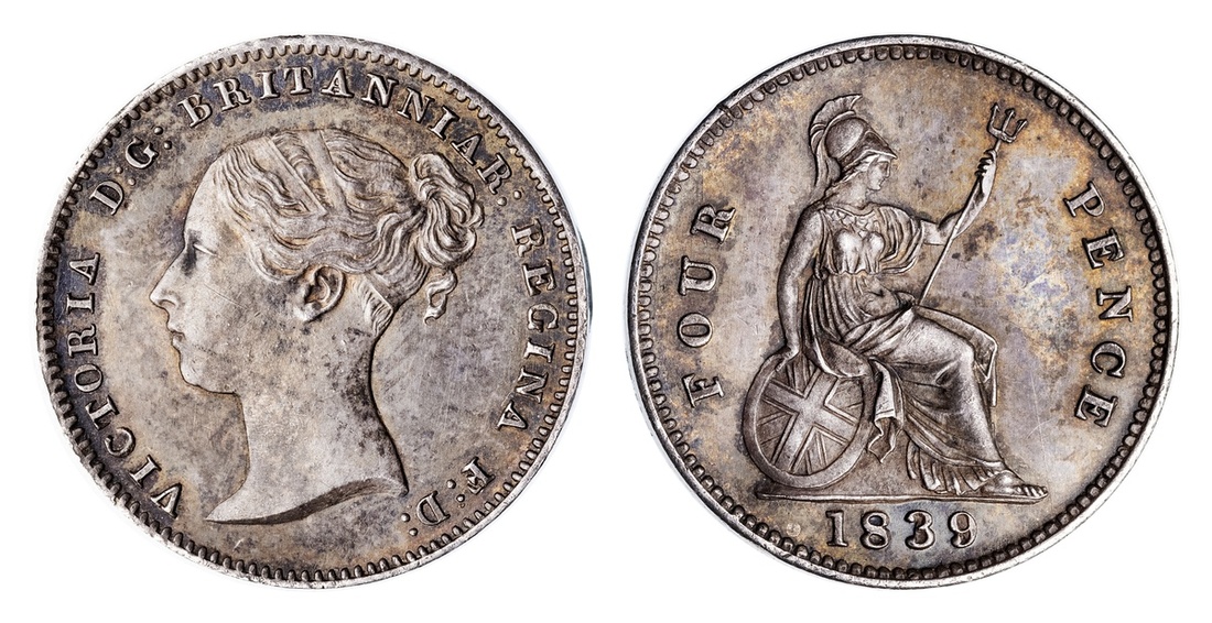 Victoria (1837-1901), Proof Groat, 1839, young head left, rev. Britannia seated right, date in exergue, edge plain, 1.89g, 6h (ESC 1933A; Bull 3325; S.3913), minor hairlines both sides and toning a trifle irregular on reverse, otherwise virtually as struck, rare