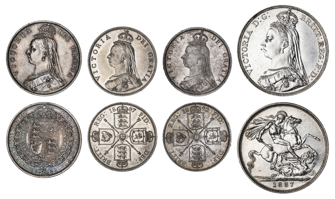 Jubilee Head Coinage (4) | Victoria (1837-1901), 'Jubilee' Crown, 1887, crowned 'Jubilee' bust left, rev. St George and Dragon, milled edge, 28.26g, 12h (ESC 296; Bull 2585; S.3921), contact marked and lightly scratched, a few dark spots, but otherwise with hints of original cartwheel lustre, good fine to very fine; and 'Golden Jubilee' Halfcrown, 1888, milled edge, 14.15g, 12h (ESC 721; Bull 2773; S.3924), emerald hues in the recesses, lightly toned, very fine; and 'Jubilee' Florins (2), 1887; 1892, crowned Jubilee bust left, rev. crowned cruciform shields, sceptres in angles, milled edge, 11.29g, 12h (ESC 868, 874; Bull 2953, 2960; S.3925), lightly bagmarked, otherwise with reflective fields and cartwheel lustre, good very fine, the 1892 florin very rare, lightly toned, very fine (4)