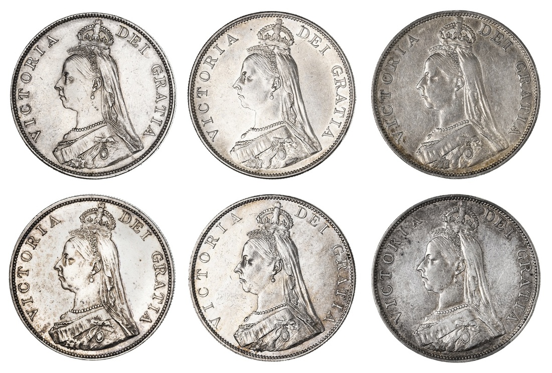 'Jubilee' Double-Florins (6) | Victoria (1837-1901), 'Jubilee' Double-Florin, 1887, 'Roman I', crowned 'Jubilee' bust left, rev. four crowned shields cruciform, sceptres in angles, edge milled, 22.62g, 12h (ESC 394; Bull 2695; S.3922), bagmarked, yet lustrous, near extremely fine; another, 1888, 'Arabic 1', as before, edge milled, 22.55g, 12h (ESC 397; Bull 2699; S.3923), contact marked, yet with a flashy lustre, nearing extremely fine; another, 1888, 'Arabic 1', as before, edge milled, 22.57g, 12h (ESC 397; Bull 2699; S.3923), wiped and bagmarked, very fine; another, 1889, 'Arabic 1', as before, edge milled, 22.56g, 12h (ESC 398; Bull 2702; S.3923), wiped and contact marked, very fine; another, 1889, 'Arabic 1', as before, edge milled, 22.59g, 12h (ESC 398; Bull 2702; S.3923), bagmarked, with a speckled tone to lustrous surfaces, bolder very fine; another, 1890, 'Arabic 1', as before, edge milled, 22.65g, 12h (ESC 399; Bull 2703; S.3923), some contact marking, otherwise with a pleasing cartwheel lustre to pearlescent grey surfaces, extremely fine (6)