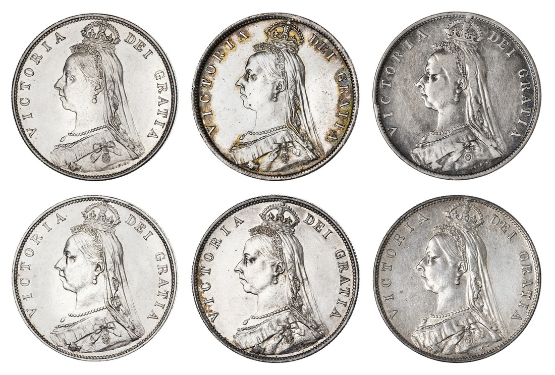 'Jubilee' Halfcrowns (6) | Victoria (1887-1901), 'Jubilee' Halfcrown, 1887, crowned 'Jubilee' bust left, rev. crowned shield in Garter, edge milled, 14.11g, 12h (ESC 719; Bull 2771; S.3924), vibrant tone in parts and lustrous, good very fine; another, 1888, as before, edge milled, 14.15g, 12h (ESC 721; Bull 2773; S.3924), obverse wiped, otherwise lustrous to reverse, bolder very fine, reverse better; another, 1889, as before, edge milled, 14.15g, 12h (ESC 722; Bull 2774; S.3924), residual lustre, very fine; another, 1890, as before, edge milled, 14.11g, 12h (ESC 723; Bull 2775; S.3924), residual lustre, very fine; another, 1891, edge milled, 14.10g, 12h (ESC 724; Bull 2776; S.3924), lightly bagmarked, with a residual lustre, very fine; another, 1892, as before, edge milled, 13.92g (ESC 725; Bull 2777; S.3924), cleaned and smoothed, strict very fine (6)