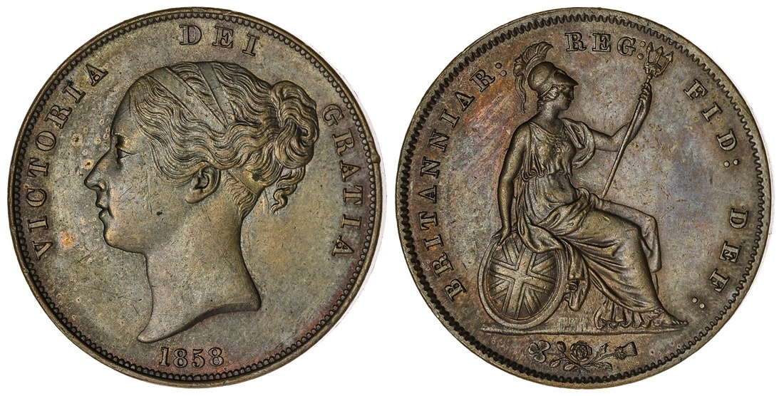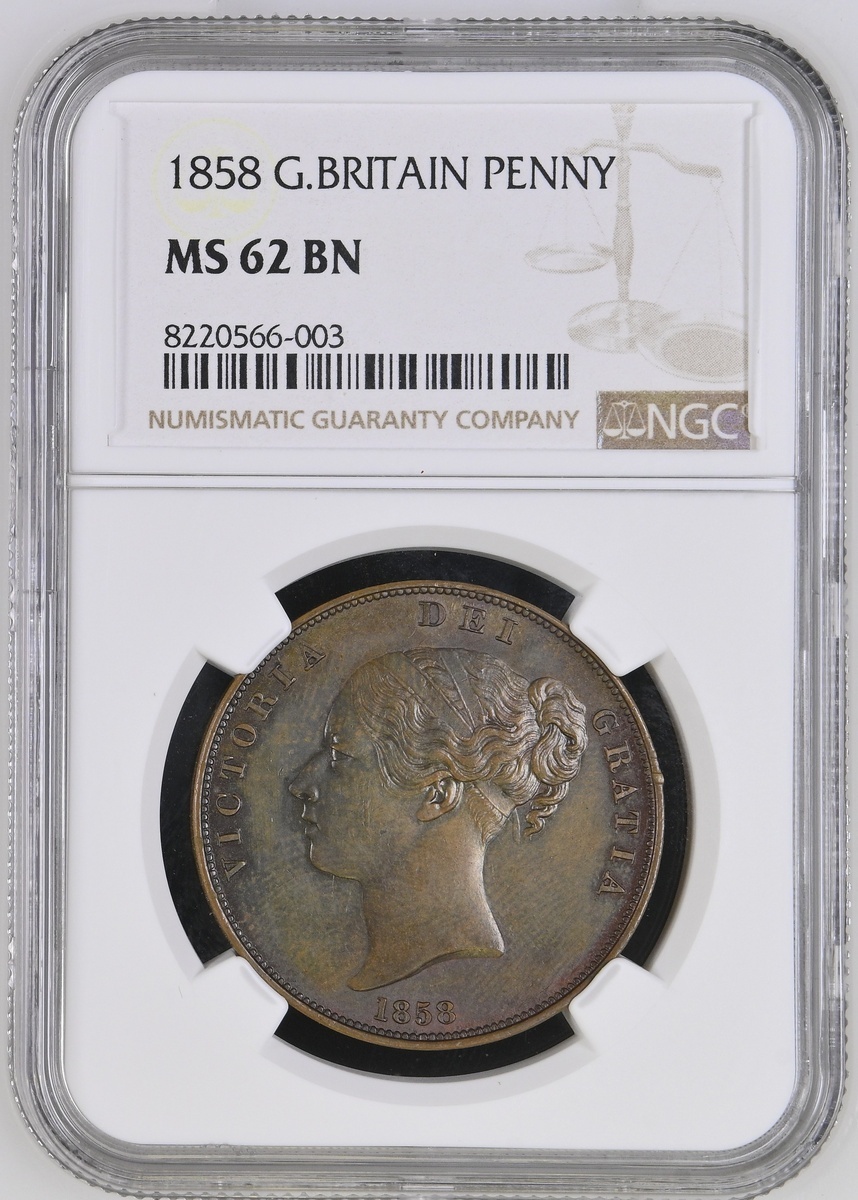 NGC MS62 BN | Victoria (1837-1901), Penny, 1858 OT, no W.W., young filleted head left, plain on truncation, rev. Britannia seated right, with ornamental trident, plain edge, 12h, 18.90g (BMC [Peck 1518; S.3948), some faint contact marks in the reverse field, otherwise richly toned and lustrous, pleasing extremely fine, in NGC holder, graded MS62 BN (Cert. #8220566-003)