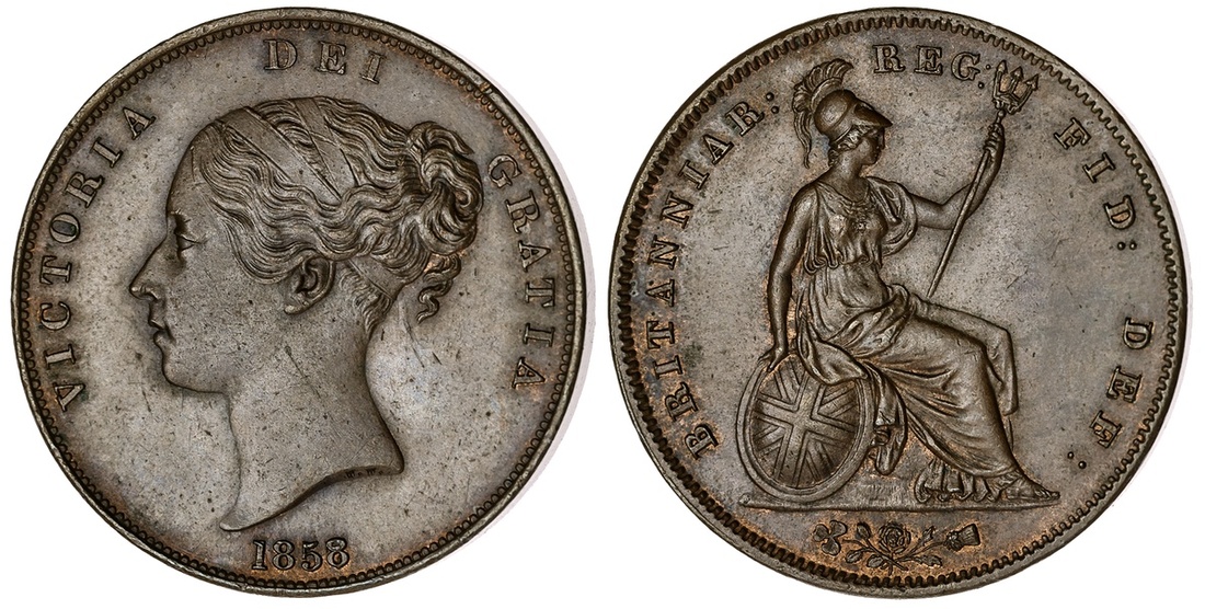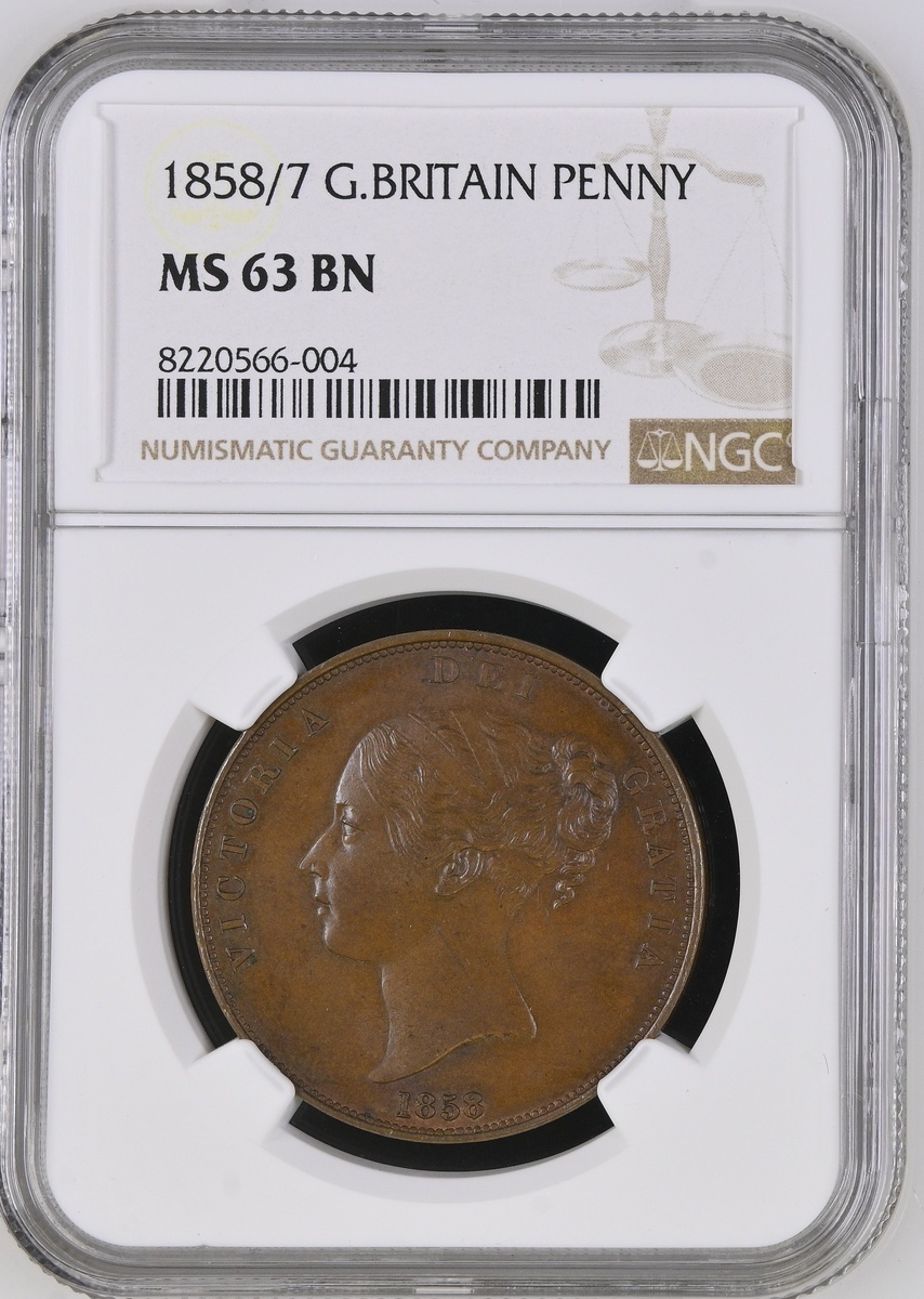 NGC MS63 BN | Victoria (1837-1901), Penny, 1858 over 7 OT, young filleted head left,