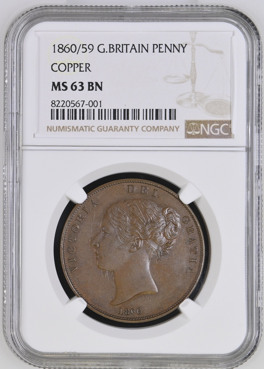 NGC MS63 BN | Victoria (1837-1901), Penny, 1860 over 59 OT, young filleted head left,