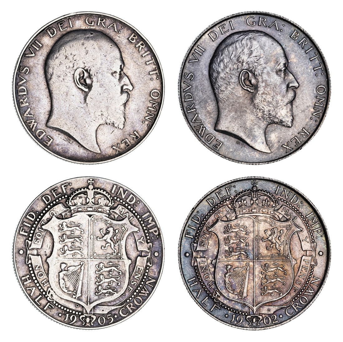 Edward VII (1901-1910), Halfcrowns (2), 1902; 1905, bare head right, rev. crowned shield in Garter, edge milled, 14.12g; 14.00g, 12h (ESC 746, 750; Bull 3567, 3571; S.3980), the first with deep toning throughout, very fine or better, the second, rubbed, yet the KEY DATE in series, very fine (2)