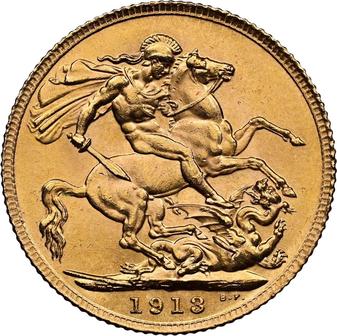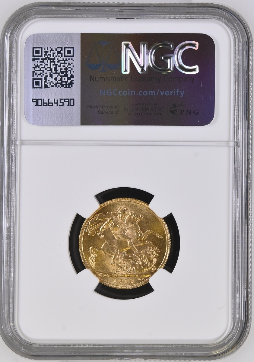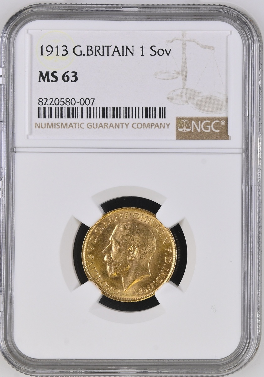 (g) NGC MS63 | George V (1910-1936), Sovereign, 1913 London, first head, edge milled, 7.99g, 12h (Marsh 215; S.3996), some minor friction marking, otherwise with a full cartwheel lustre, pleasing extremely fine, in NGC holder, graded MS63 (Cert. #8220580-007)