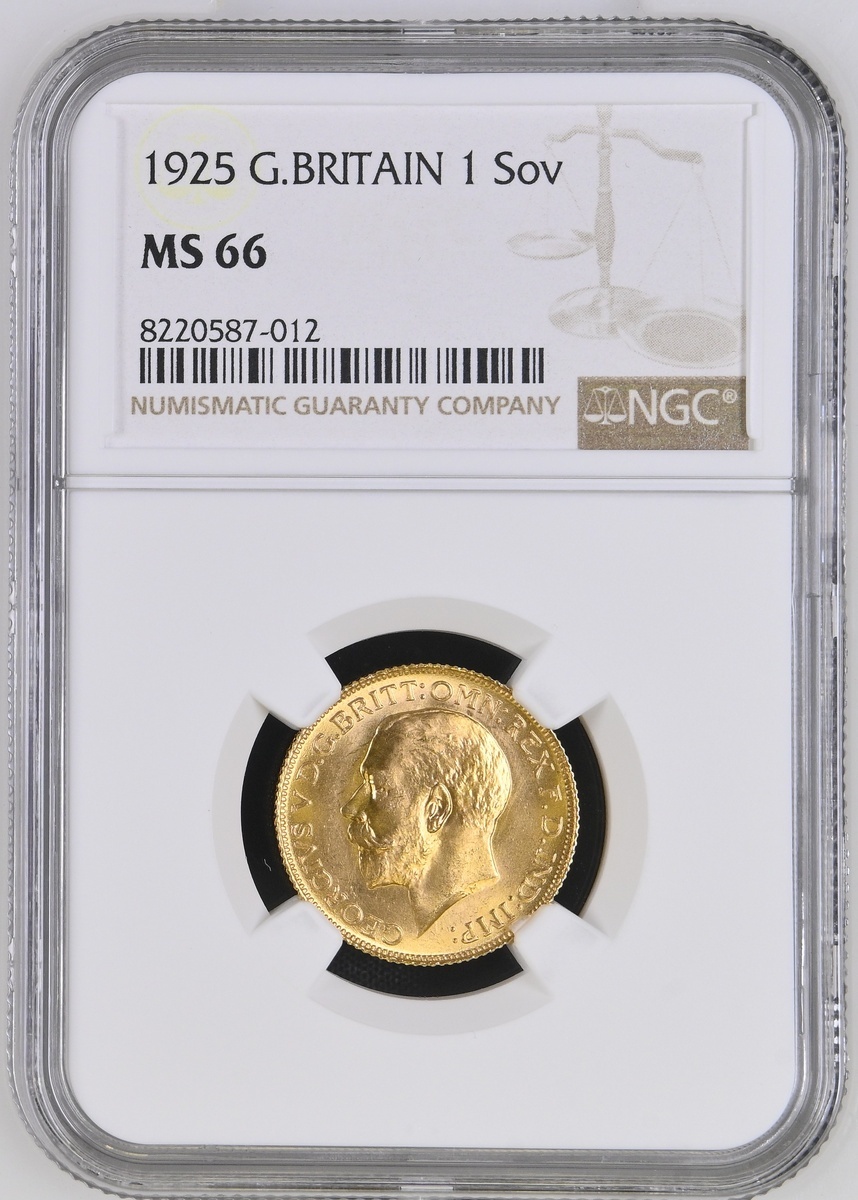 (g) NGC MS66 | George V (1910-1936), Sovereign, 1925, first head, edge milled, 8.01g, 12h (Marsh 220; S.3996), faint bagmarks on cheek, otherwise supremely choice, FDC, in NGC holder, graded MS66 (Cert. #8220587-012)