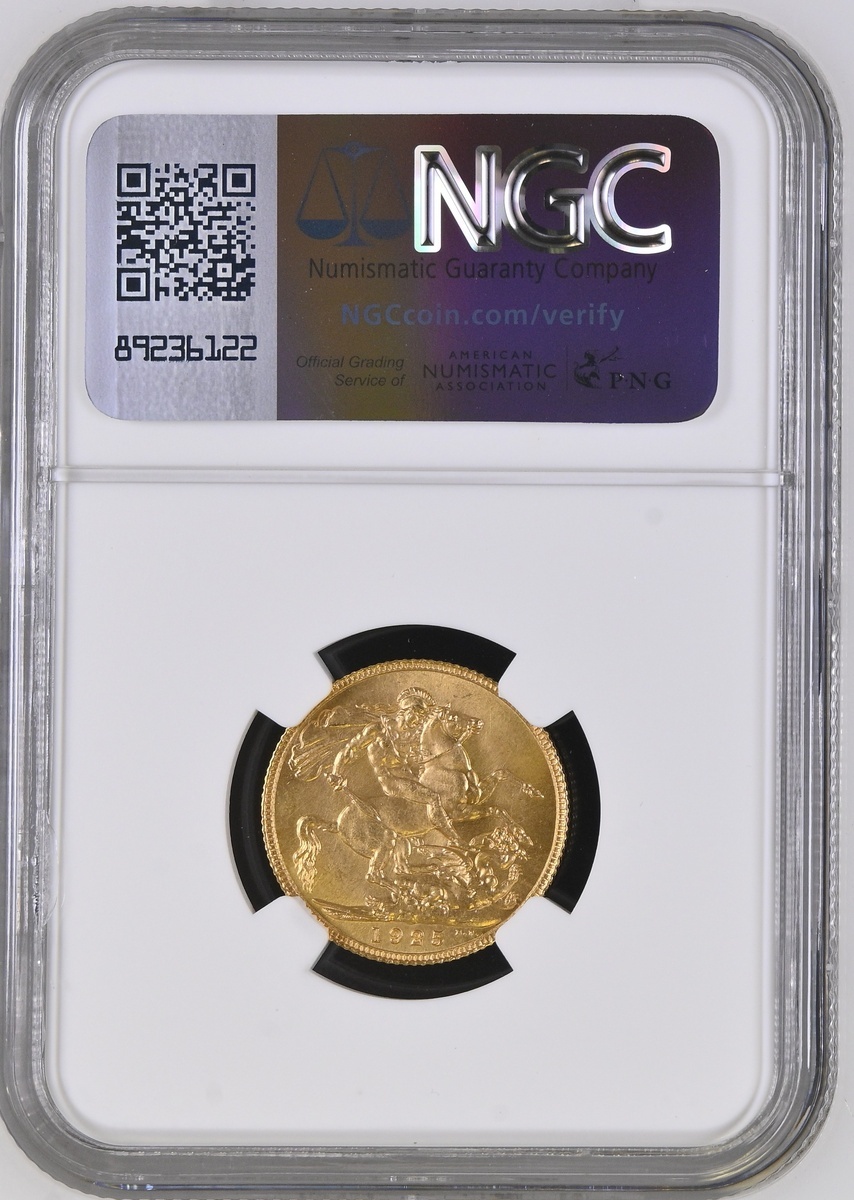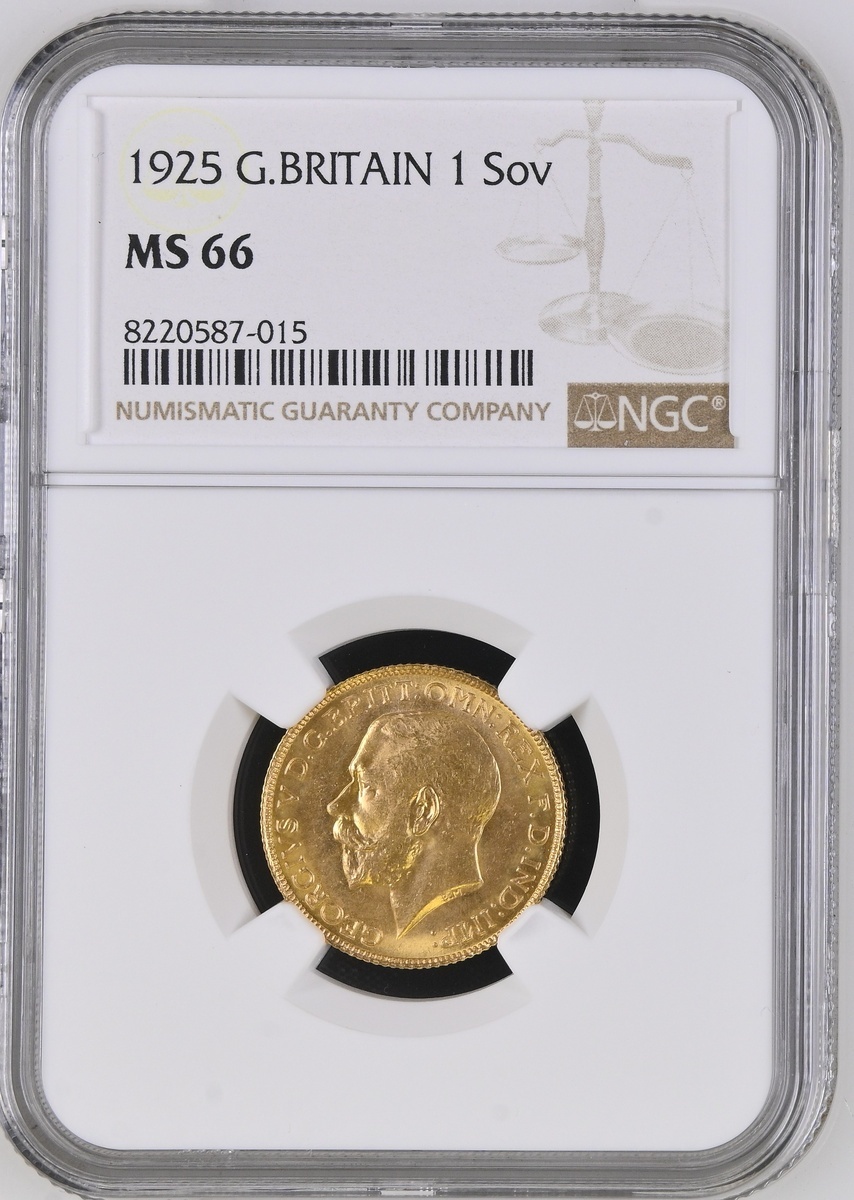 (g) NGC MS66 | George V (1910-1936), Sovereign, 1925, first head, edge milled, 7.98g, 12h (Marsh 220; S.3996), choice, FDC, in NGC holder, graded MS66 (Cert. #8220587-015)