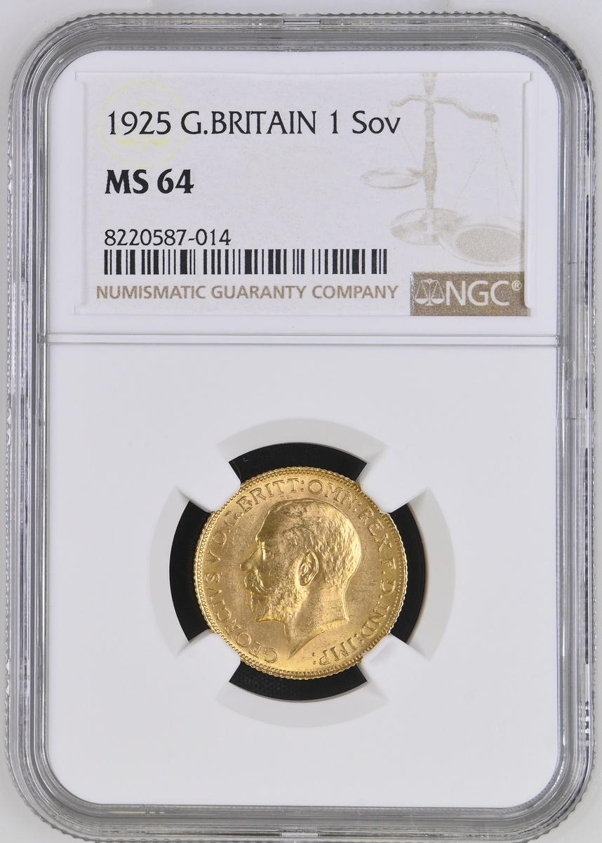 (g) NGC MS64 | George V (1910-1936), Sovereign, 1925, first head, edge milled, 7.98g, 12h (Marsh 220; S.3996), wonderfully choice, FDC, in NGC holder, graded MS64 (Cert. #8220587-014)