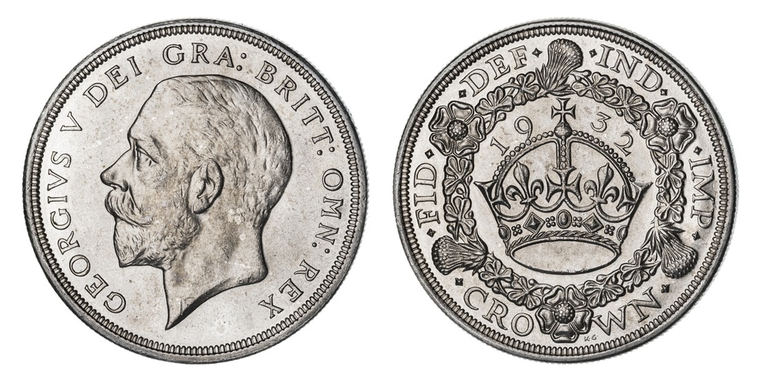 George V (1910-1936), 'Wreath' Crown, 1932, bare head left, rev. crown in wreath, edge milled, 28.20g, 12h (ESC 372; Bull 3641; S.4036), lightly bagmarked to the face and a scattering of toning spots, otherwise the fields with a glossy near brilliance, about extremely fine, one of only 2,395 struck