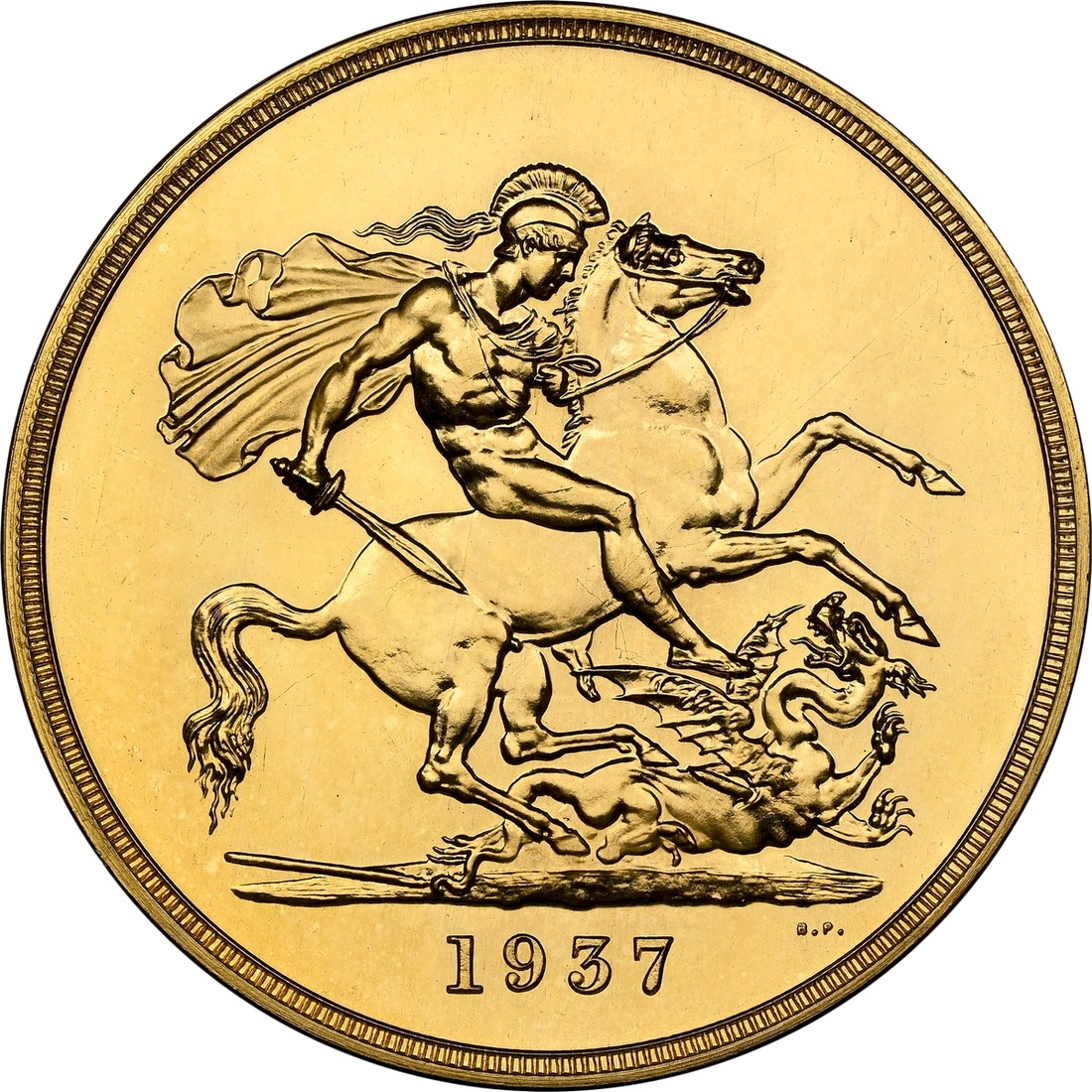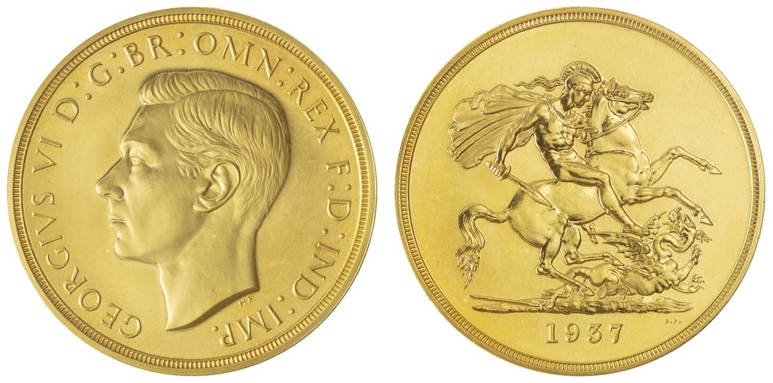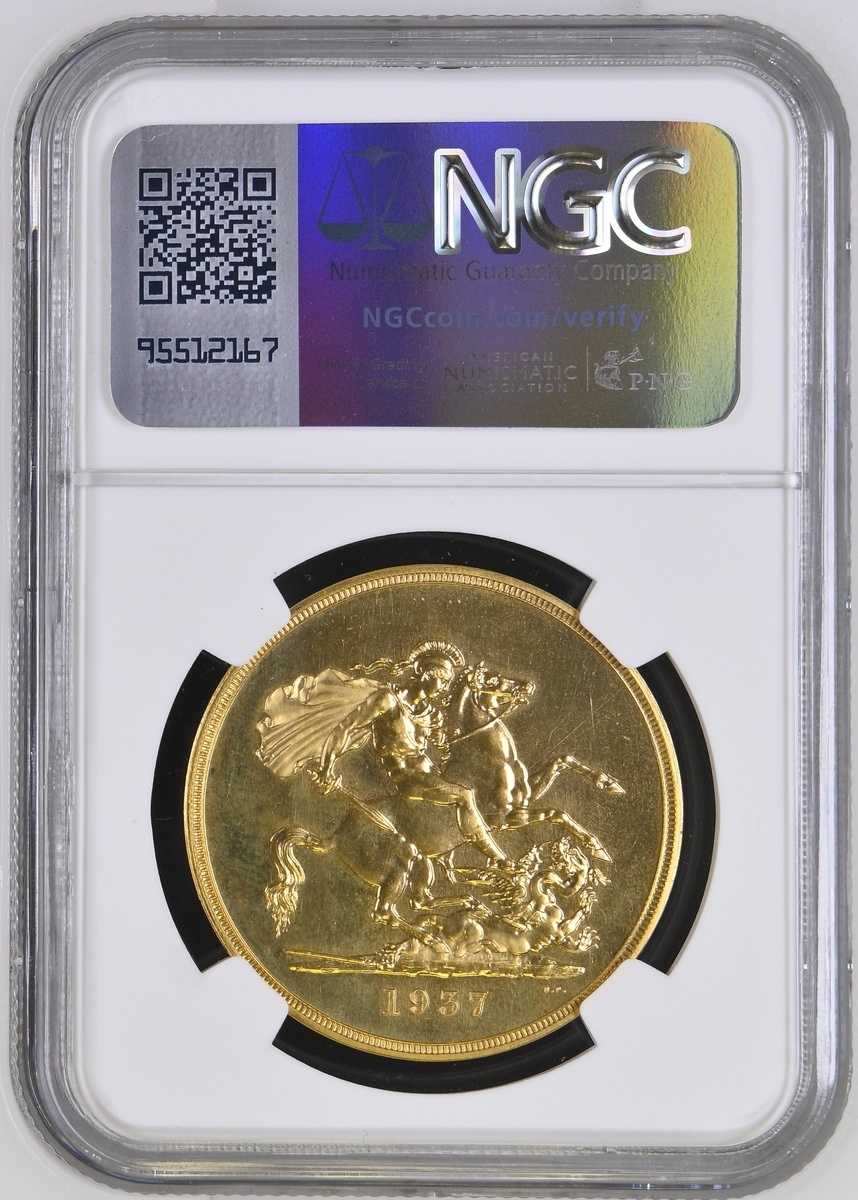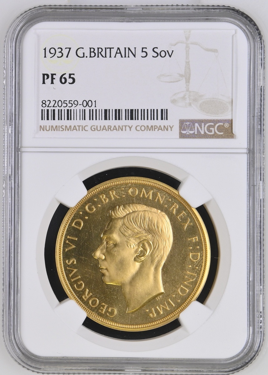 (g) NGC PF65 | George VI (1936-1952), Coronation 'Specimen' Proof Five-Pounds, 1937, bare head left, rev. St. George and Dragon, edge plain, 39.96g, 1h (L&S 1; W&R 435; Schneider II, 670; Hill F40; EGC 1454; S.4074), light cabinet friction in otherwise brilliant fields, the portrait with pleasing cameo definition, good extremely fine, in NGC holder, graded PF65 (Cert. #8220559-001)