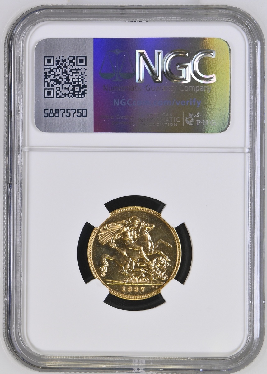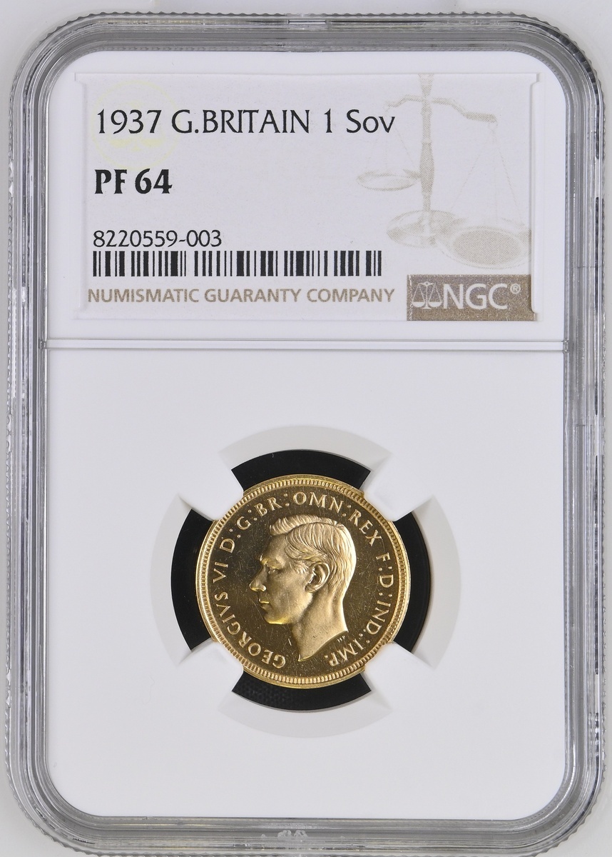 (g) NGC PF64 | George VI (1936-1952), Coronation 'Specimen' Proof Sovereign, 1937, bare head left, rev. St George and Dragon, edge plain, 7.99g, 12h (Marsh 296C; W&R 439; EGC II, 1461; S.4076), minor cabinet friction in otherwise brilliant fields, good extremely fine and much as struck, in NGC holder, graded PF64 (Cert. #8220559-003)