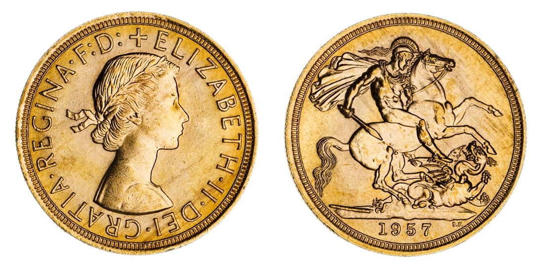 (g) Elizabeth II (1952-2022), Sovereign, 1957, first laureate head, finely milled edge, 7.97g, 12h (Marsh 297; S.4124), very lightly contact marked, more so to the obverse, otherwise attractively lustrous, extremely fine, the first currency Sovereign of Her Late Majesty's reign, and only date to possess the fine edge milling
