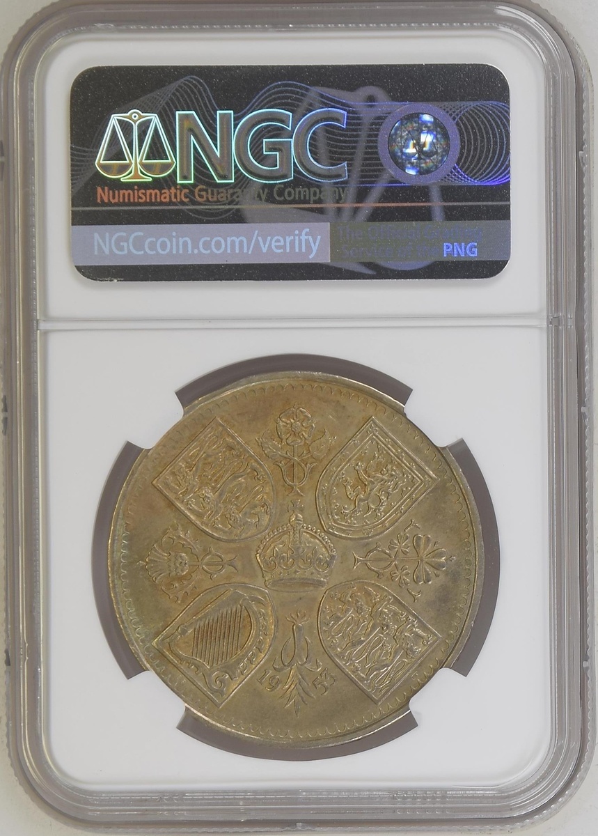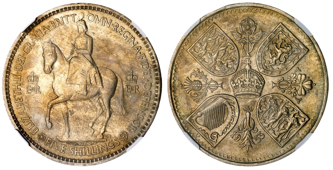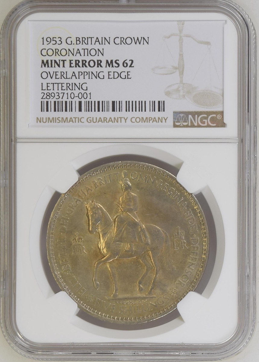 NGC MINT ERROR MS62 | Elizabeth II (1952-2022), 'HIP HOP' ERROR, Coronation Crown, 1953, London, Queen on horseback, rev. crown in centre of emblematical cross, shield of arms in each angle, error edge, irregularly spaced, reads FAITH AND TRUTH I WILL BEAR UNTO YO, 28.36g, 12h (ESC 4344; S.4136), bruise to reverse edge at 11 o'clock, otherwise lightly toned and RARE due to the missing U caused by incorrect spacing on edge, bold very fine and an extremely rare and most sought after error of the Decimal series, in NGC holder, graded MINT ERROR MS62 (Cert. #2893710-001)