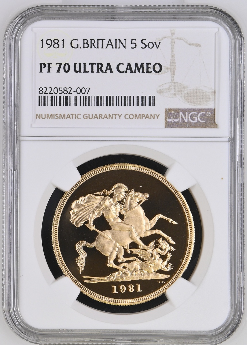 (g) NGC PF70 ULTRA CAMEO | Elizabeth II (1952-2022), Proof Five-Pounds, 1981, crowned bust right, by Arnold Machin, rev. St George and Dragon, edge milled, 39.94g*, 12h, (S.SE1), brilliant, as struck, in NGC holder, graded PF70 ULTRA CAMEO (Cert. #8220582-007)