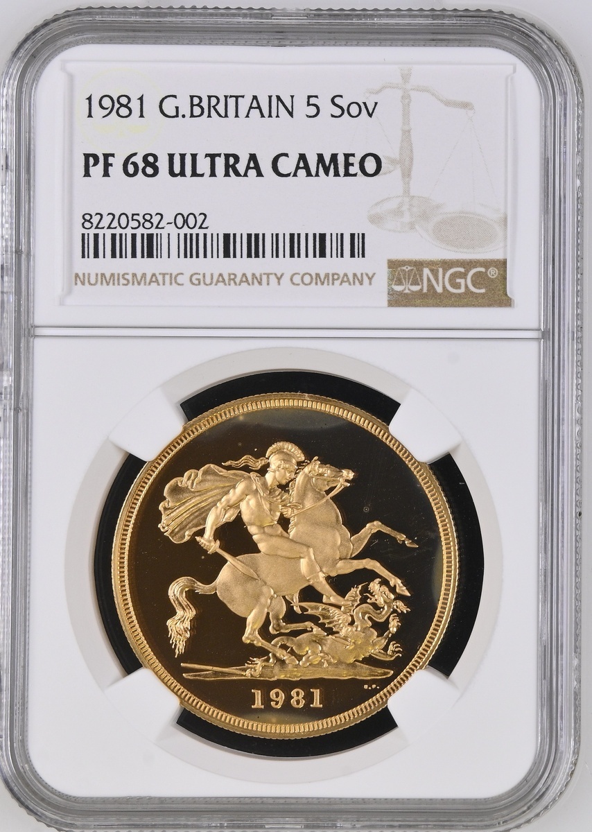 NGC PF68 ULTRA CAMEO | Elizabeth II (1952-2022), Proof Five-Pounds, 1981, crowned bust right, by Arnold Machin, rev. St George and Dragon, edge milled, 39.94g*, 12h, (S.SE1), brilliant, as struck, in NGC holder, graded PF68 ULTRA CAMEO (Cert. #8220582-002)