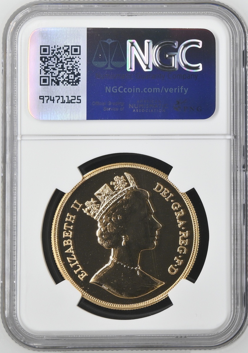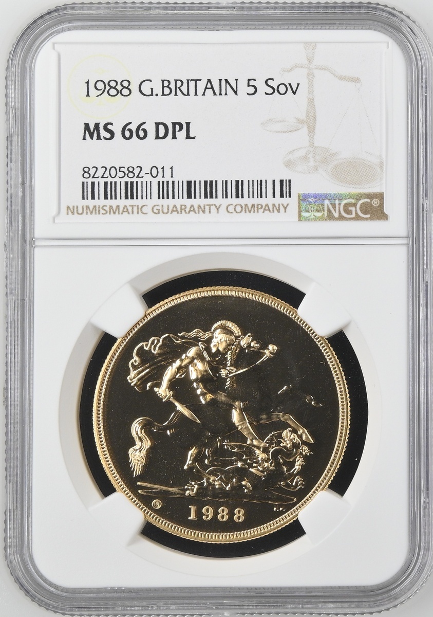 (g) NGC MS66 DPL | Elizabeth II (1952-2022), Five-Pounds, 1988, crowned bust right, by Raphael Maklouf, rev. St George and Dragon, edge milled, 39.94g*, 12h (S.SE5), lightly fingermarked and handling marks, otherwise brilliant, much as struck, in NGC holder, graded MS66 DPL (Cert. #8220582-011)