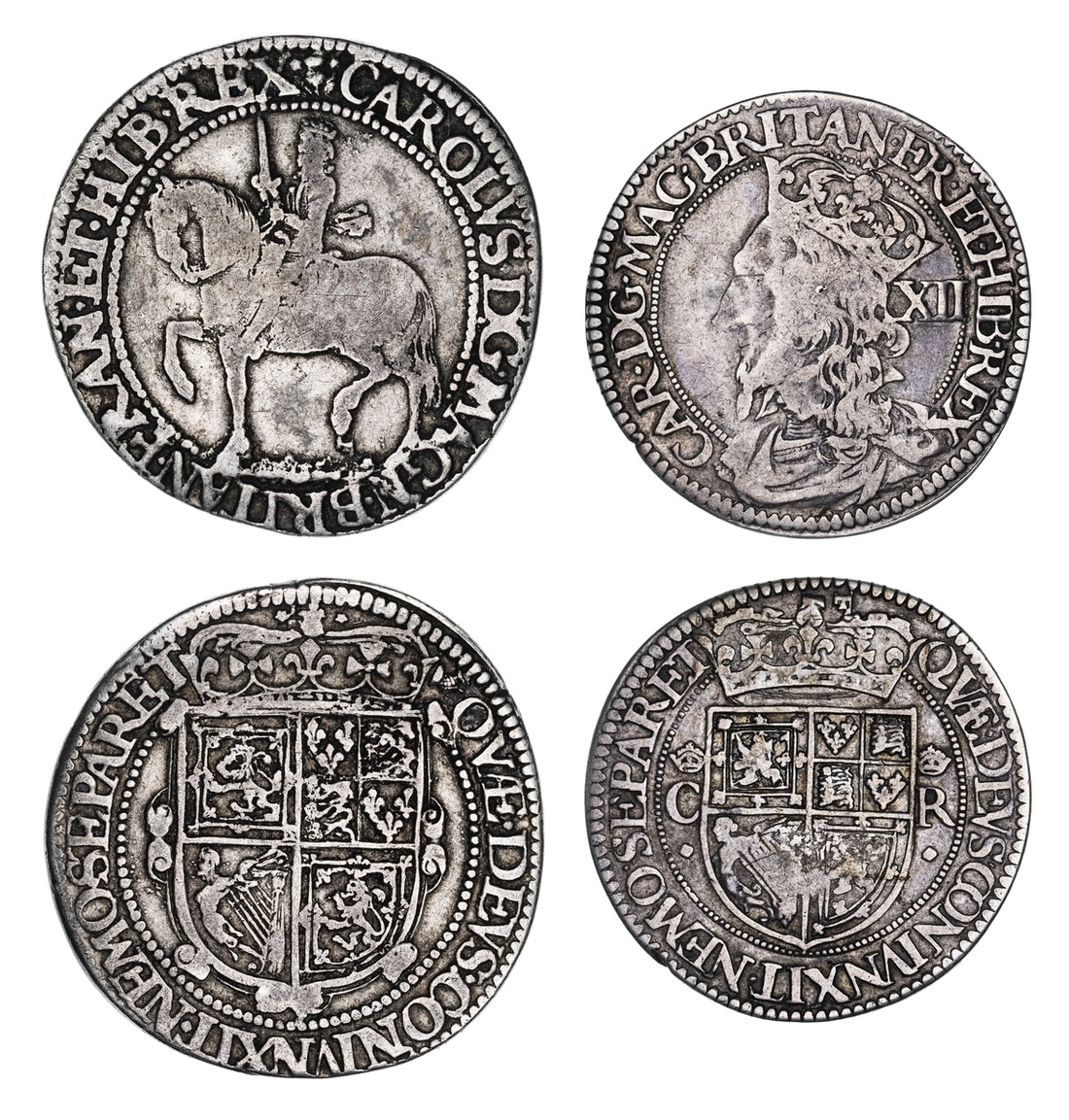 Scotland, Charles I (1625-1649), Third Coinage, Thirty Shillings, F by horse's hoof, rough ground below horse, rev. crowned shield, stars above, 14.63g, 6h (S.5556), worn at the central devices on obverse, reverse better, toned, fine or better; and Twelve Shillings, rev. F over crown, 5.60g, 9h (S.5560), portrait blundered from wear, similar on reverse, fine to very fine (2)