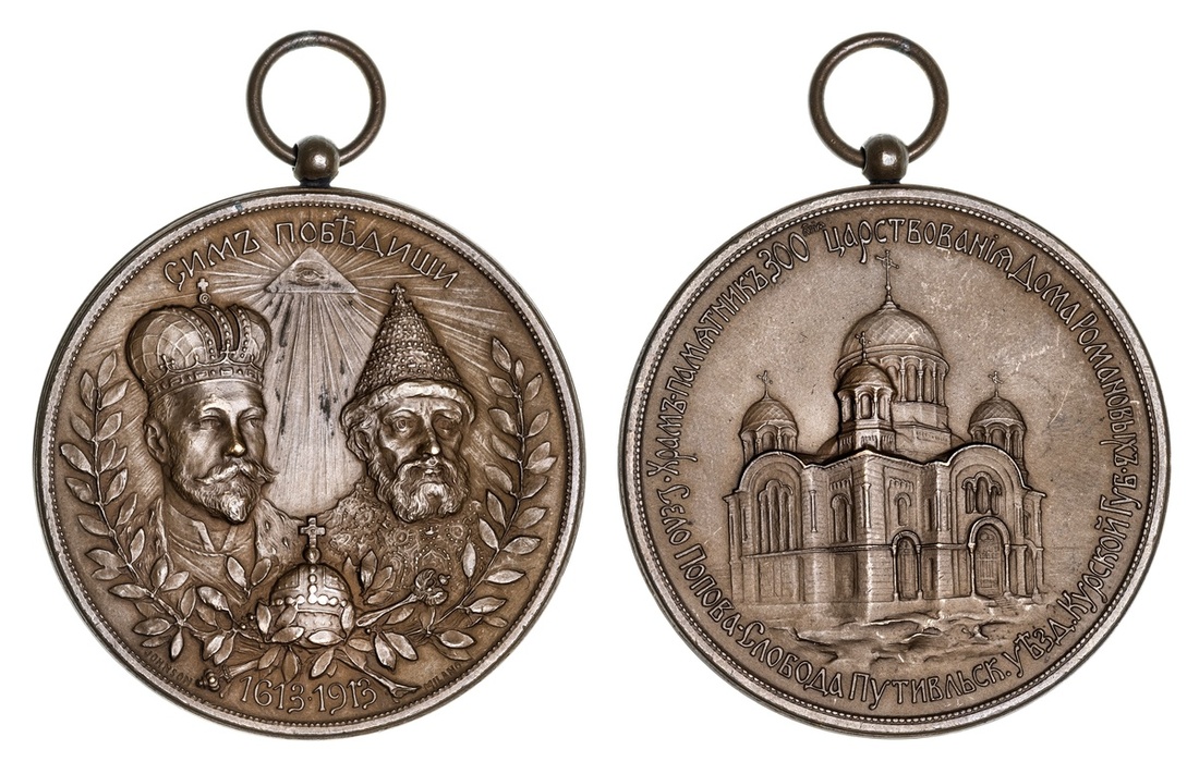 [Tsarist] Russia, 300th Anniversary of the House of Romanov, AE Medal, c.1913, by Johnson, Tsar Nicholas II and Michael Feodorovich, within wreath, rev. view of church, plain edge, 48mm, 47.65g, mounted with suspension loop, extremely fine, scarce
