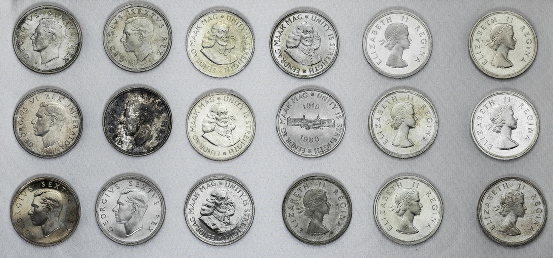 South Africa, George VI (1936-1952) and Elizabeth II (1952-2022), Collection of Silver Crowns, 1947-1967 (18), many of very low mintage, including KEY DATE of 1957, of which only 1,600 struck, choice mint state, some brilliant, others proof-like, in custom fitted case (18)