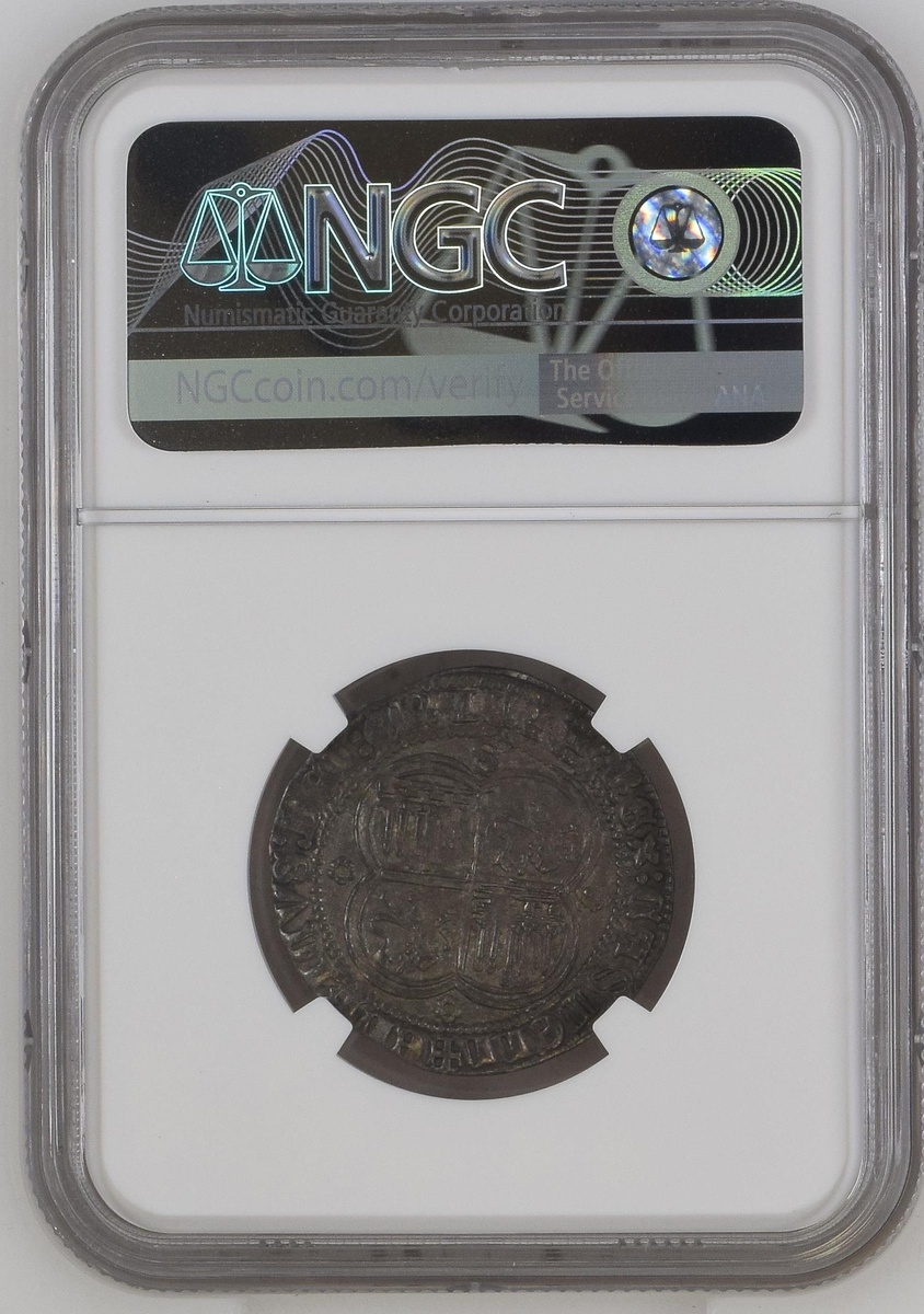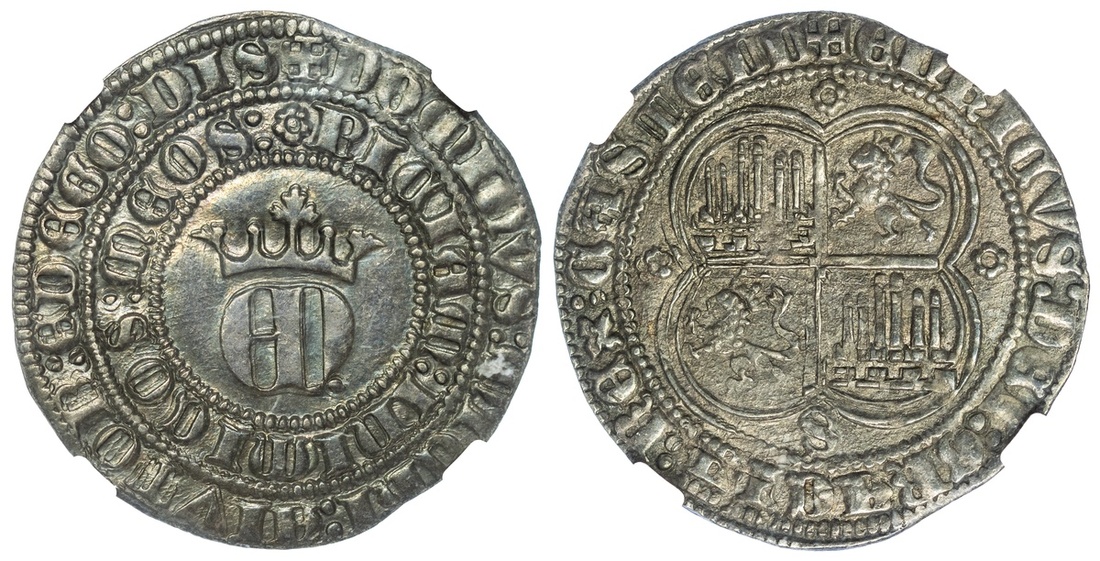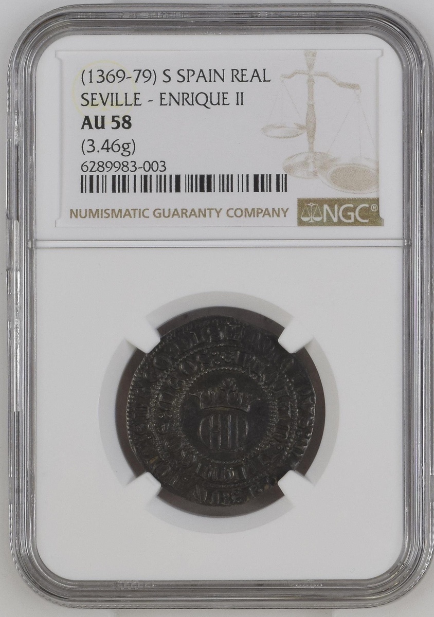 NGC AU58 | Spain, Kingdoms of Castile and León, Enrique II (1369-1379), Real, undated (c.1373-1379), Seville, crowned EN monogram, rev. quartered arms in quadrilobe, rosettes in angles, S below, 6h, 3.46g (AB 406), darkly toned, very fine, in NGC holder, graded AU58 (Cert. #6289983-003)