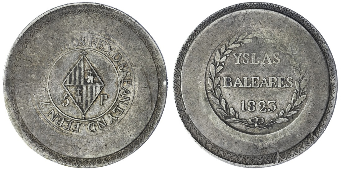 Spain, Kingdom of Mallorca, Ferdinand VII, Second Reign (1813-1833), 5 Pesetas, 1823, coats of arms dividing 5-P, within legend, rev. YSLAS BALEARES 1823, within wreath, edge milled, 26.80g, 12h (KM CL9.2; Cal. 533), partially softly struck, otherwise with a uniform grey tone, very fine