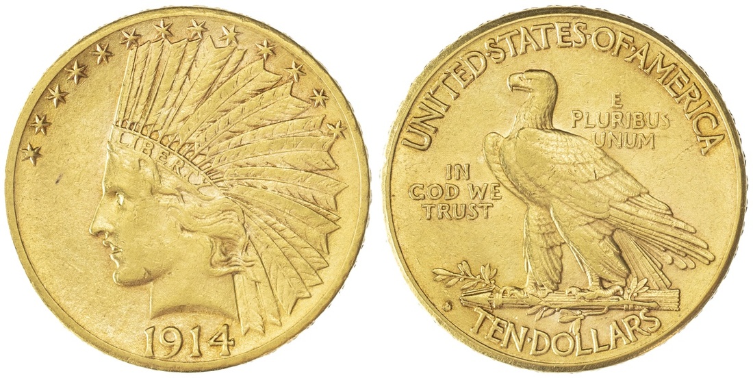 (x) USA, 'Indian Head' Half-Eagle of Ten-Dollars, 1914 D, $10, Denver, Indian head left, rev. eagle facing left, security edge, 16.69g, 6h (Fr 166; KM 130), some light bagmarks, otherwise with a residual cartwheel lustre, golden-red hues in peripheries, good very fine