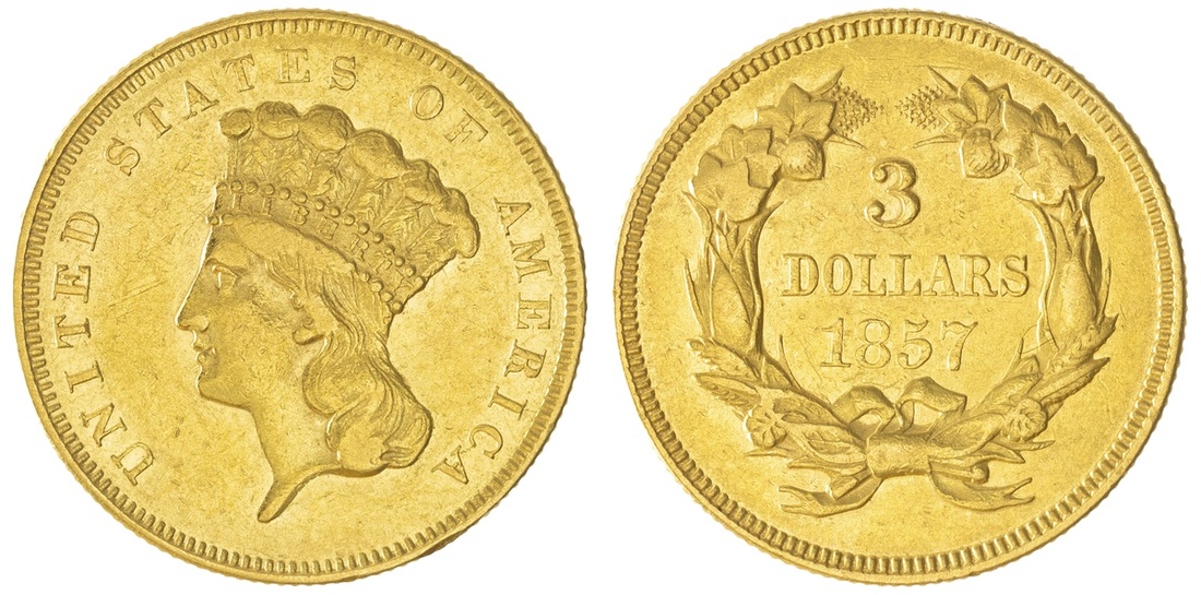 (g) USA, Gold Three-Dollars, 1857, $3, Philadelphia, by James Barton-Longacre, Princess head left, rev. value and date in wreath, DOLLARS in small lettering, edge milled, 4.98g, 6h (KM 84), wiped and lightly bagmarked, yet with a glimmer of lustre to the peripheries, very fine, an ever popular and enduringly collectable type