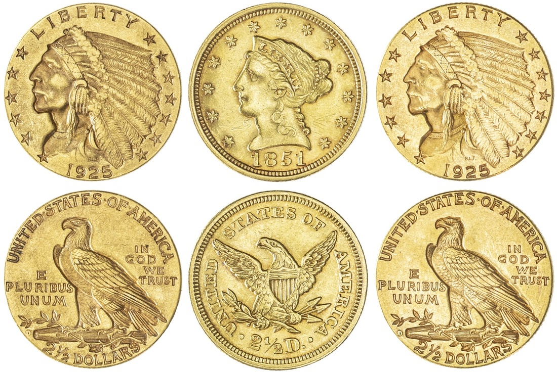 (x) USA, 'Coronet Head' Quarter-Eagle of Two-and-Half Dollars, 1851, Philadelphia, edge milled, 4.17g, 6h (KM 72), some scratches to obverse field, otherwise with a pleasing flashy lustre, very fine; another, 'Indian Head' Quarter-Eagle of Two-and-Half Dollars, 1925 D, Denver, edge milled, 4.18g, 6h (KM 128), some light contact marks, otherwise lustrous, red to the recesses, about extremely fine; another, 'Indian Head' Quarter-Eagle of Two-and-Half Dollars, 1925 D, Denver, edge milled, 4.15g, 6h (KM 128), with hairline scratches, red to recesses, very fine (3)