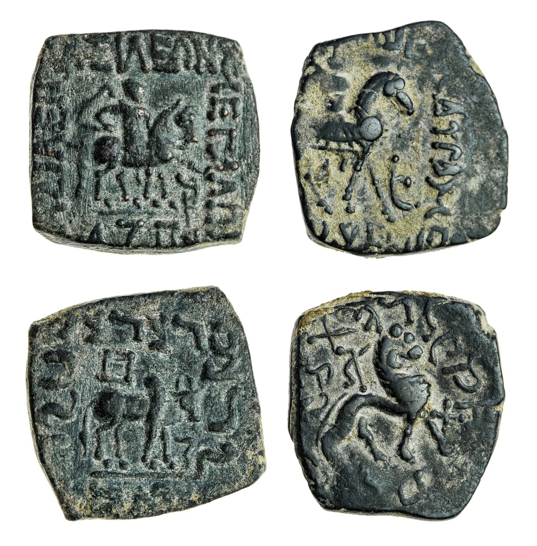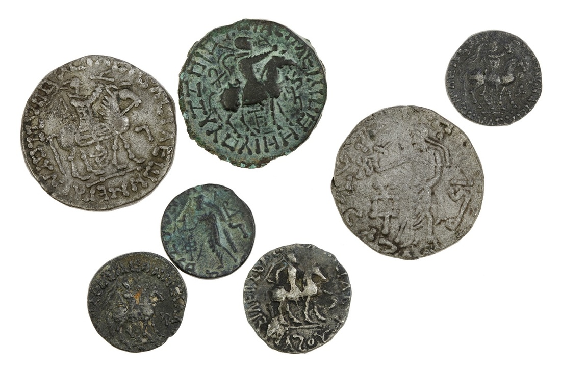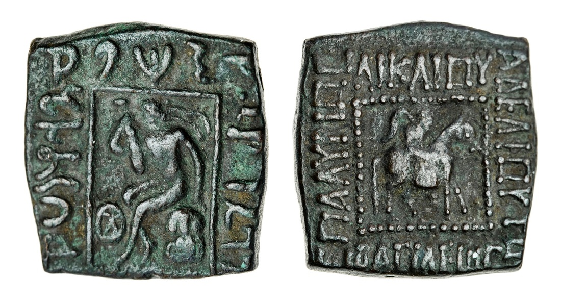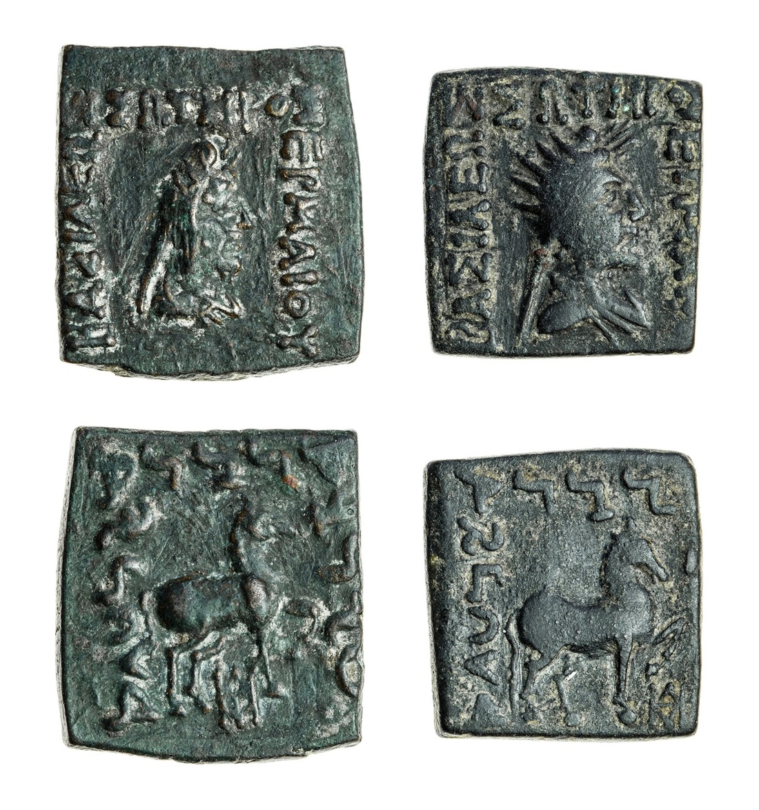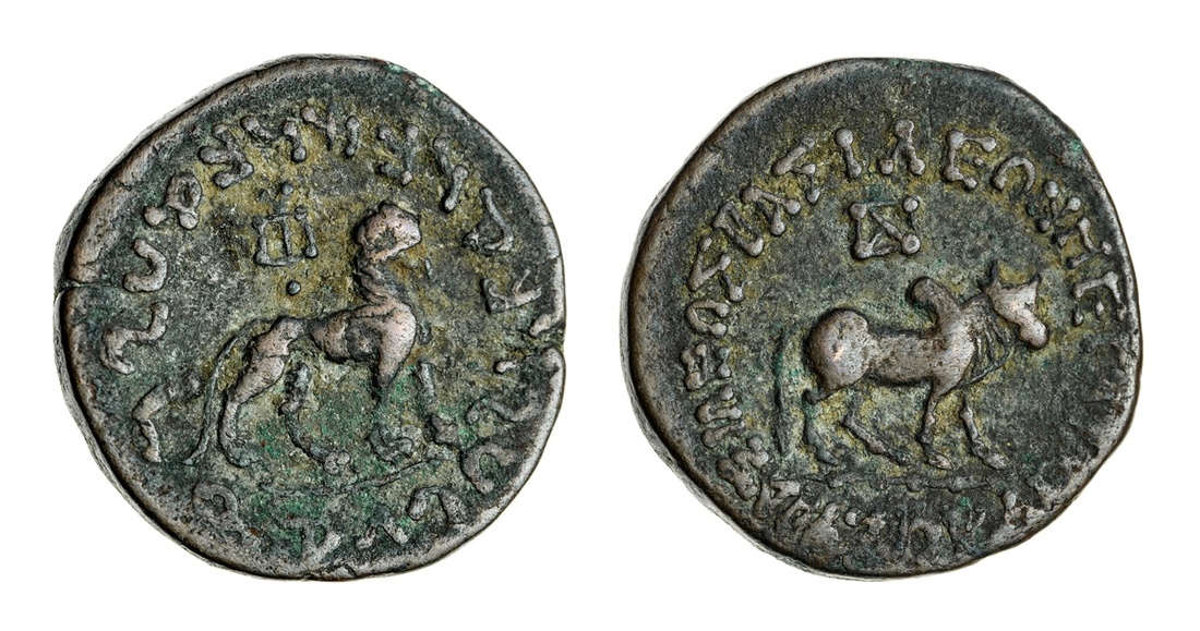 Indo-Greek and Indo-Scythian (14) | Indo-Greek Kingdom, Hermaeus (c.40-1 BC), square AE Units (2), 8.65g; 7.71g, bearded bust of Zeus/Mithra right, wearing Phrygian cap, rev. horse standing right, one hoof raised, monogram in different place on each coin (Bopearachchi 9B/D; SNG ANS 1348, 1353; M.416, 7), both very fine or a little better, better than average for type; Indo-Scythian, Vonones with Spalirises (c.75-65 BC), square AE Unit, 8.73g, horseman right, holding a whip with a beaded square frame, Greek legend, rev. Herakles seated left on a rock with lion skin, holding a club , monogram bottom left, within a square frame with Kharoshthi legend (Senior 69.2; M.691; MAC 2165), well framed with all legends clear, pleasingly toned, very fine; Azes (c.58-12 BC), square AE Unit, 11.91g, Poseidon standing facing with one foot on horned river god, holding trident right, Greek legend, rev. yakshi standing facing between vines, monogram bottom left, kharoshthi legend (Senior 77.1; M.740; MAC 2210), about very fine / fine, scarce and interesting; AE Unit (Tetradrachm), 13.76g, zebu bull standing right, monogram above, Greek legend, rev. lion standing right, monogram above, kharoshthi legend (Senior 102.130; M.850; MAC 2386-7), with some natural deposit remaining on surfaces giving good definition to the designs, an impressive piece, very fine; square AE Unit, 11.00g, king on horseback right, holding whip and spear, Greek legend, Kharoshthi letter bottom right, rev. zebu bull standing right, monogram above, kharoshthi legend (Senior 121.11; M.834; MAC 2327-30), obverse once heavily cleaned, but fields now have an attractive powdery tone, very fine / good very fine; Kharahostes, Satrap in Chach (c.20-1 BC), square AE Unit, 7.31g, king on horseback right, Greek legend, Kharoshthi letter bottom right, rev. lion standing right, monogram and letter above back, kharoshthi legend (Senior 143.2; M.887; MAC 2476), fields with residual deposit showing main designs to good effect, about very fine / very fine; together with Indo-Scythian, Azes and Apracharaja derivatives (c. 58 BC - first century AD), Tetradrachms (3); Drachms (4), all with king on horseback right, rev. Tetradrachm of Azes with Zeus standing left, Tetradrachms of the Apracharajas (2) with Pallas standing right, one an anonymous posthumous issue, the other of Itravasu, the Drachms with Zeus (2), Pallas (2) (Senior 90, 98, 105, 175, 177; M.753, 847, 858, 859, 867, 897; MAC 2234, 2357, 2426, 2432, 2433, 2449, 2482), selected for clarity of design and condition, very fine to extremely fine (14)
