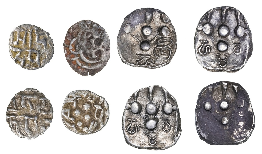Pre-Islamic, Sind, Anonymous (c. 7th-early 8th century), uniface AR Dammas (4), pattern of four prominent beads with Brahmi legend below: 'Ha Ma Va' (2), 'Ha Shi', 'Ha Gu' (Fishman JONS, 3A, 7A, 9A), known mainly from this one hoard, rarely offered and intriguing, some with dark hoard stain, but uncirculated; Chach of Sind (one-time ascribed to Gharlibids), Anonymous (pre 712), Drachms (4), three central beads flanked by Brahmi letters 'Ta' and 'Pa', Arabic Lillah Shibl or similar below and above, rev. Devanagari legend SriJaYan / TaRaJa (Victorious King) (3), crude head right (1) (Fishman/Todd, "The Silver Damma," M54; MNI 269-76), scarce and interesting example of early Arabic influence on coins of this area, generally fine (8)