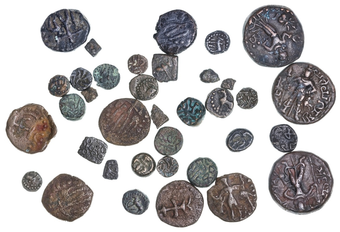 India, Post-Kushan, Yaudheya (c. 3rd-4th century), AE Units (3), god Karttikeya standing facing holding a sceptre, peacock on right, Brahmi legend yaudheya ganasya jaya (victory to the Yaudheya people), rev. goddess Devasena, standing left, either alone or flanked by two symbols (Pieper, Ancient Indian Coins Revisited, 1125, 1126, 1127; MAC 4707-26), generally very fine, above average for type; Kidarite, Kota Kula (c. 3rd-4th century), AE Units (7), crude representation of Siva and bull, rev. Kota symbol, one coin with legend kota bala (Pieper, Ancient Indian Coins Revisited, 1280-90; MAC 3674-84), fine to very fine; Nagas of Narwar (c.200-340), small AE Units (18), symbol or animal, rev. Brahmi legend naming various rulers, includes representatives of most types (MAC 4729-53), fine to very fine, together with unidentified small coins of same period (10), fair to fine (38)