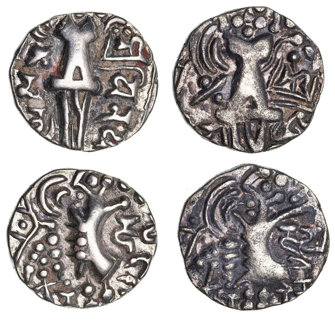 India, Post-Kushan, Kidarite, Durla Deva (5th century), base gold Dinar, 7.25g, abstract figure of king standing left, Brahmi letter Kato left, Kidara, jaya(ti) right, rev. crude figure of 'Ardoksho' facing, part of Brahmi legend,deva to left, sri Dur(la] in right field; Vinayaditya (late 5th century), base gold Dinar, 7.46g, similar design, but obv. legends, ka, in left field, jayati partially visible to right, rev. in left field, ditya, in right field sri vinaya (MAC 3651-2, 3656), the first toned good very fine, scarce, the second about extremely fine, above average for type (2)