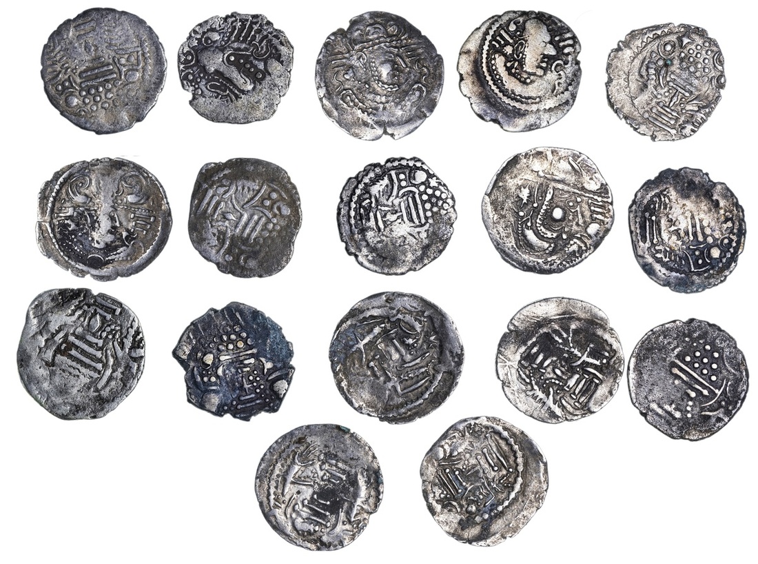 India, Post-Gupta, Gujarat (8th-10th century), Sasanian-derived Drachms "Gadhaiya Paisa" (17), bust right, derived from that of Sasanian ruler Peroz (13), with Hunnic influence (4), rev. variants on the 'fire altar and two attendants' design, sometimes assigned to the Pratiharas and Chavadas of Gujarat (Deyell 154, 155; MNI 325-334; also catalogued in detail in, K.K. Maheswari, Imitations in Continuity, Tracking the Silver Coinage of Early Medieval India, IIRNS Publications, 2010), visually appealing, selected for variety of design and quality of portrait, fine to good very fine, most with tickets referencing Maheswari listing, rarely offered and intriguing (17)