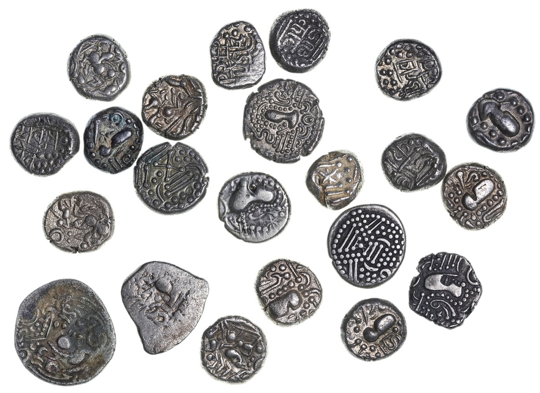 India, Post-Gupta, Gujarat & Malwa (c.10th -13th century), Sasanian-derived Drachms "Gadhaiya Paisa" (22), Pratihara / Pala (2), crude bust right with Brahmi letters, rev. fire altar within beaded design, Chaulukyas (4), cruder bust, rev. stylised fire altar on stand, Vaghelas (1), very crude design, Malwa (Paramara?) derivative Paisas (15), of similar type, with fish-hook 'nose' to bust (1), with letter behind bust (2), with reverse legend sri omkara (3), with battle scene reverse (6), with reverse legend sri jaitavarma deva(3) (possibly referring to Jayavarman, 1255-74) (Deyell 55, 156-59, 160, 166 (reverse legend), 167-177; MNI 355-67, 419-40; also catalogued in, K.K. Maheswari, Imitations in Continuity, Tracking the Silver Coinage of Early Medieval India, IIRNS Publications, 2010), above average for type, rare with legends and battle-scene, good fine to good very fine, most with tickets (22)