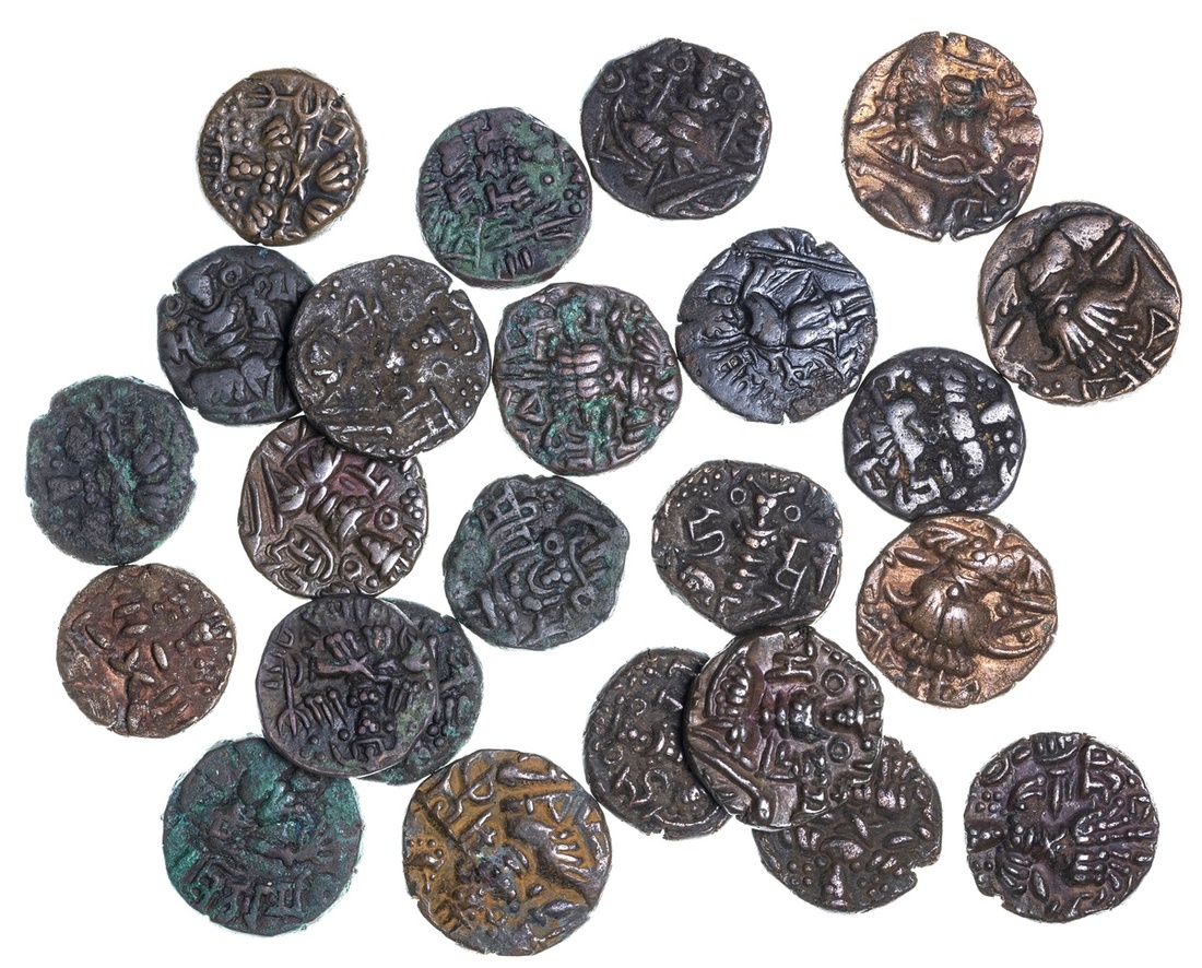 India, Medieval Kashmir, Hephthalite, Toramana II (c.530-70), AE Staters (2), Duptala Dynasty, successors of Toromana II (c.570-855), AE Staters (3), together with AE Staters of: Sankaravarman (883-902), Sugandha Rani (904-06), Kshemagupta with Didda Rani (950-58) (2), Nandigupta (972-73), Didda Rani (979-1003), Sangrama Deva (1003-28) (2), Ananta Deva (1028-63) (2), Kalasa (1063-89) (2), Harsha (1089-1101) (2), Sussala (1112-20), Jayasimha (1123-55), Paramanuka (1155-65), Jaga Deva (1199-1213) (2) (MNI 151-4, 155-58, 159, 164-66, 172, 174-6, 177-8, 179-80, 181-82, 183-45, 185-9, 190, 191, 192, 193-6), an unusually good selection, each with a descriptive ticket, good fine to extremely fine (24)