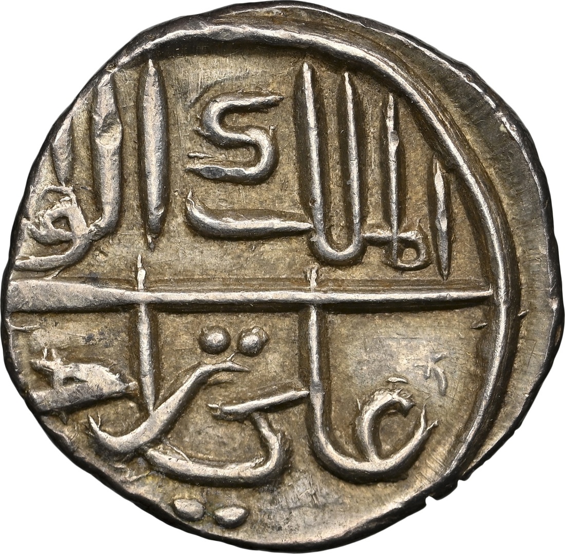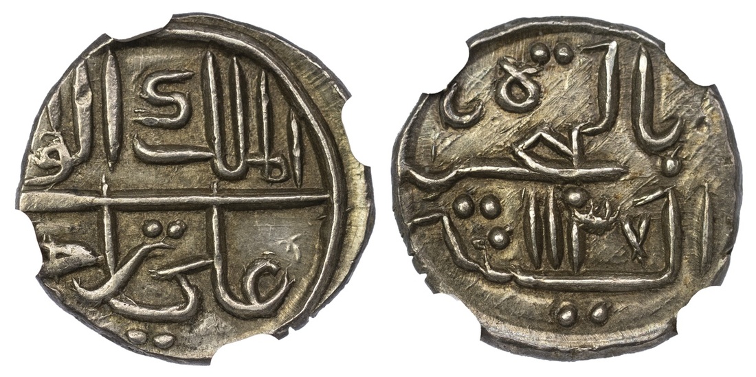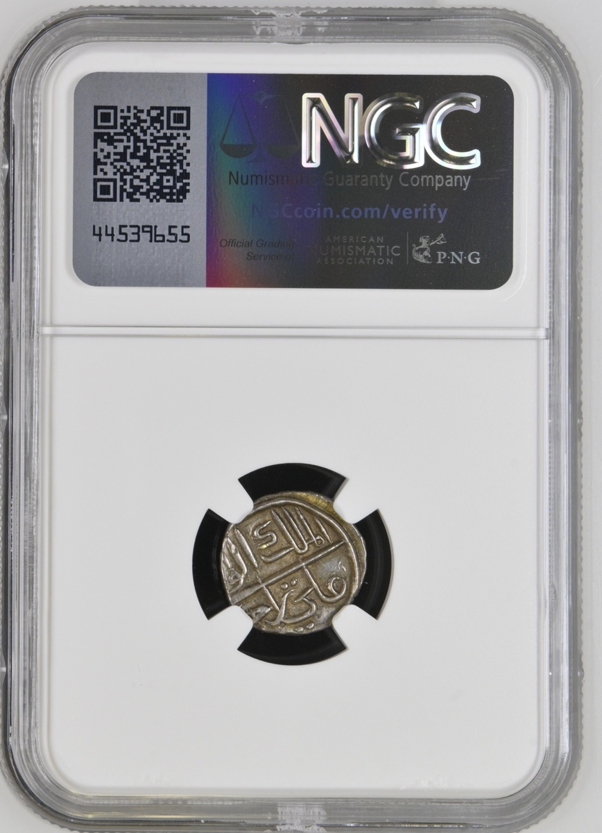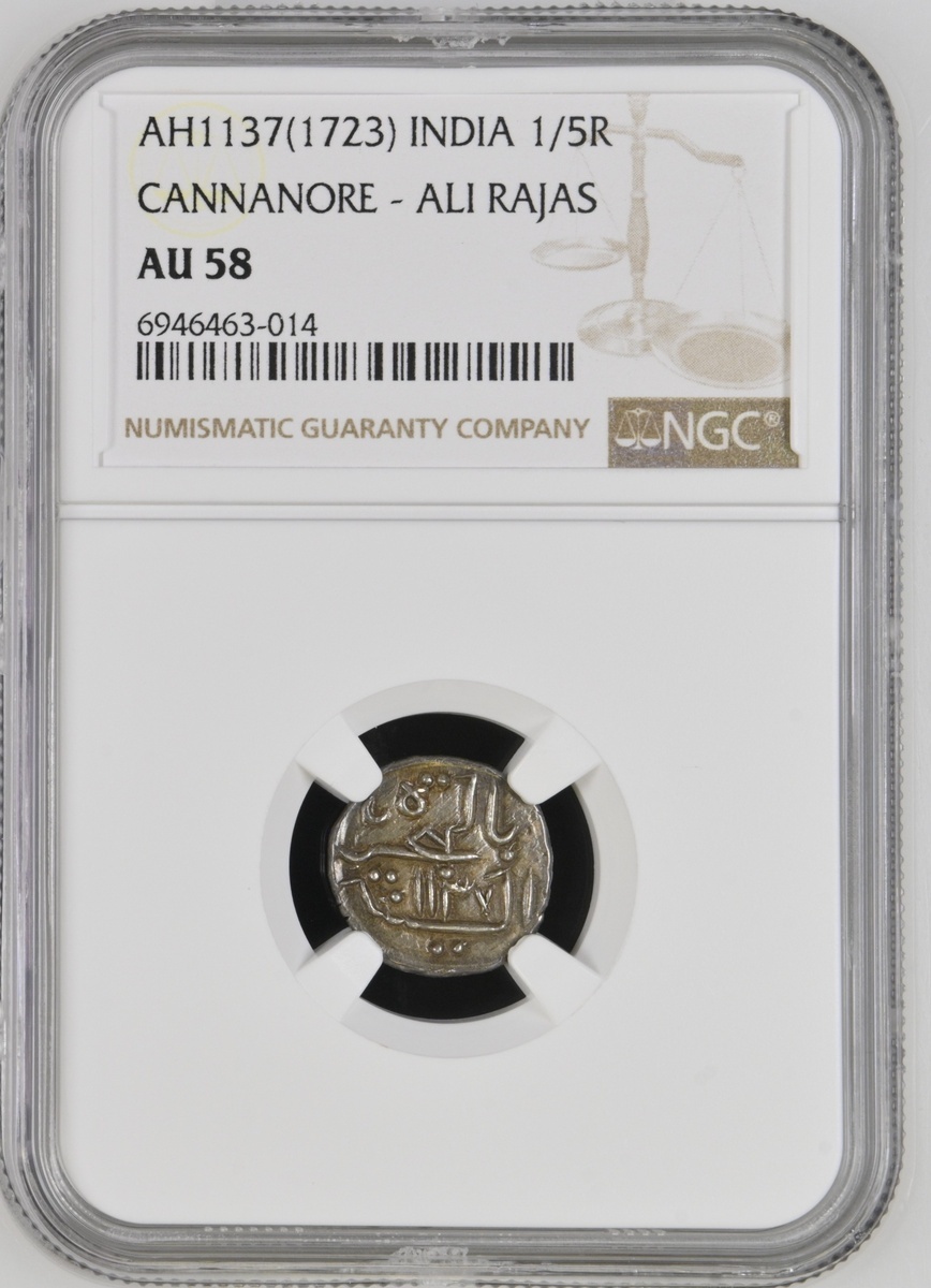 NGC AU58 | *Top Pop* | South India, Cannanore, Ali Rajas (AH 1122-1231/1710-1810 AD), 1/5-Rupee, 2.25g, AH1137, al-malik al-wali 'Ali Raja / bi al-bahr wa al-bar (Guardian of the Kingdom, 'Ali Raja, of the sea and the land) (KM 5), attractive cabinet tone, extremely fine, in NGC holder, graded AU58 *Top Pop* (Cert. #6946463-014)