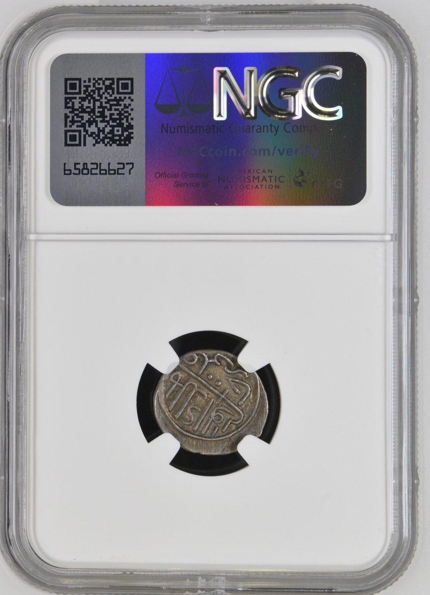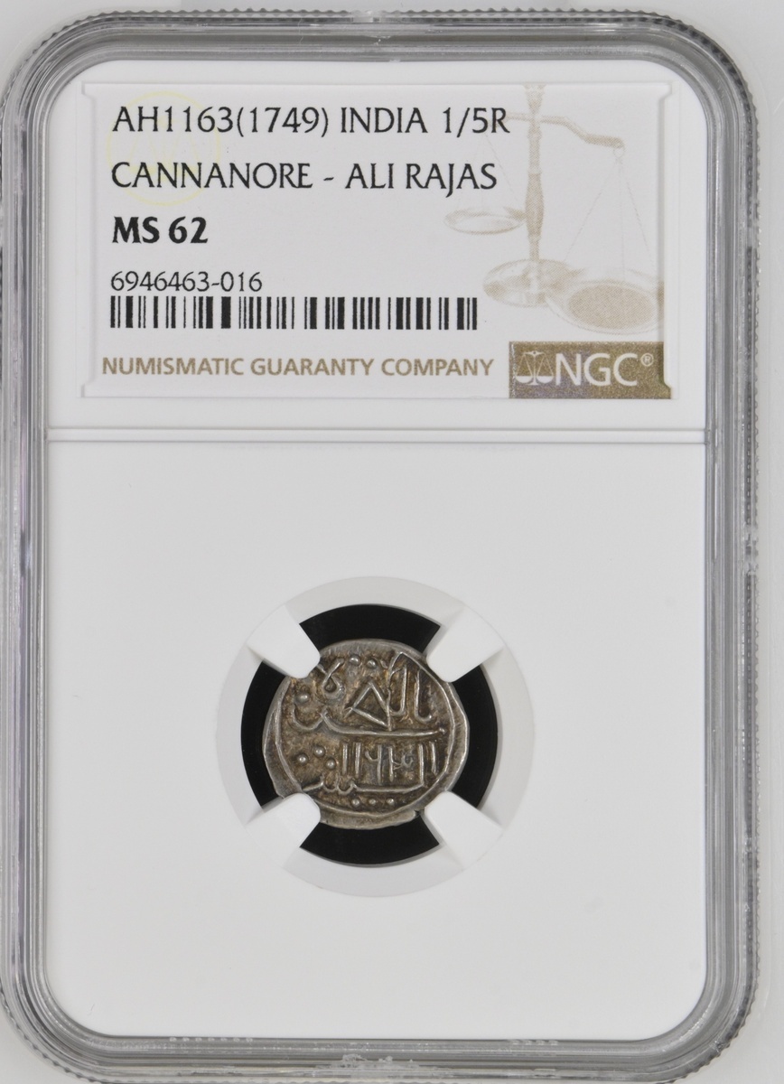 NGC MS62 | *Top Pop* | South India, Cannanore, Ali Rajas (AH 1122-1231/1710-1810 AD), 1/5-Rupee, 2.25g, AH1163, al-malik al-wali 'Ali Raja / bi al-bahr wa al-bar (Guardian of the Kingdom, 'Ali Raja, of the sea and the land) (KM 5), attractive cabinet tone, extremely fine, in NGC holder, graded MS62 *Top Pop* (Cert. #6946463-016)