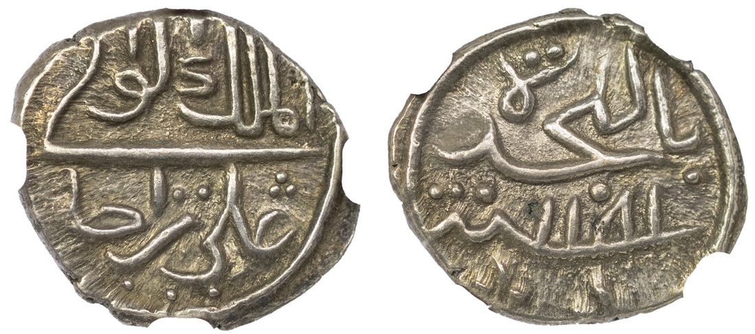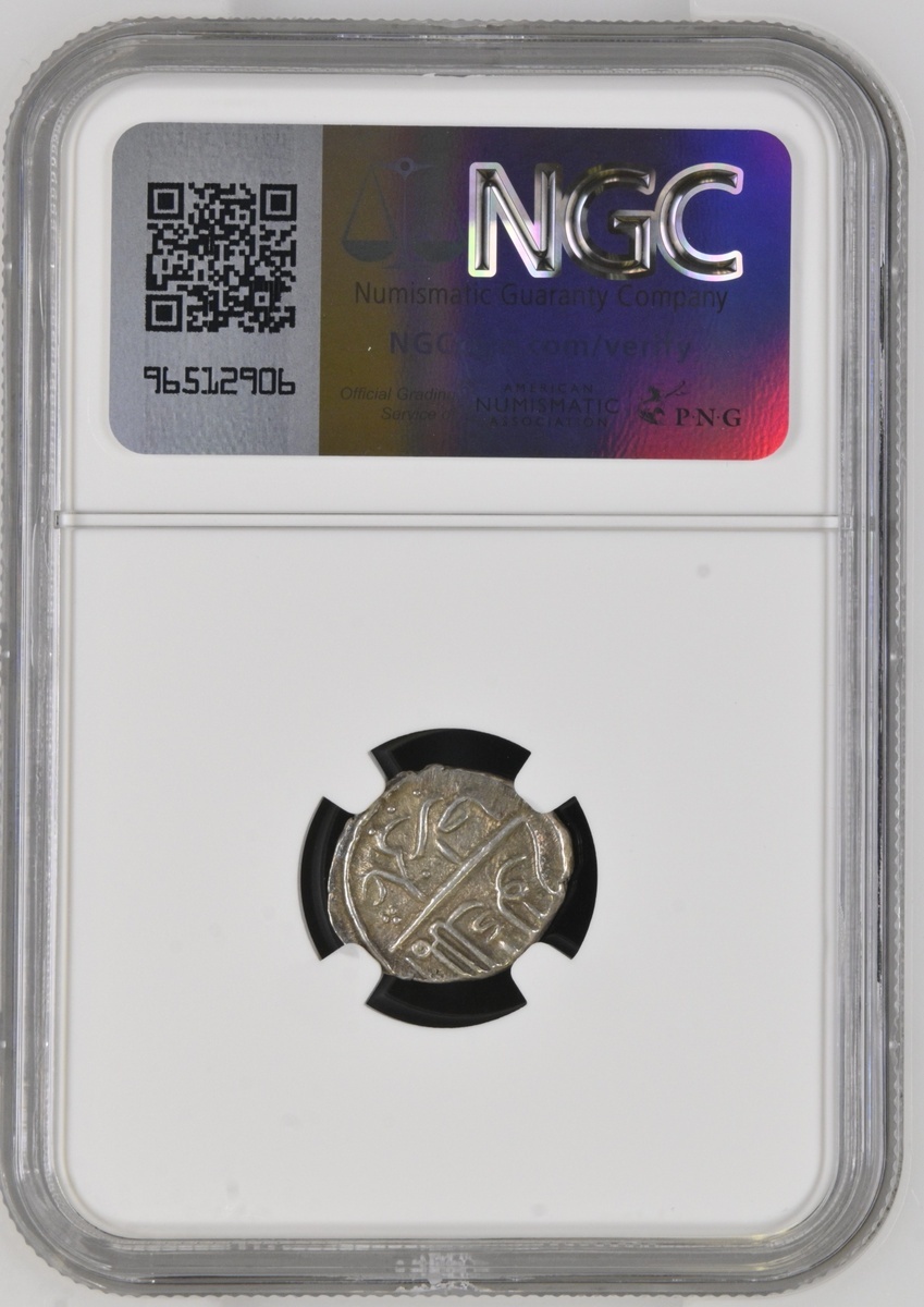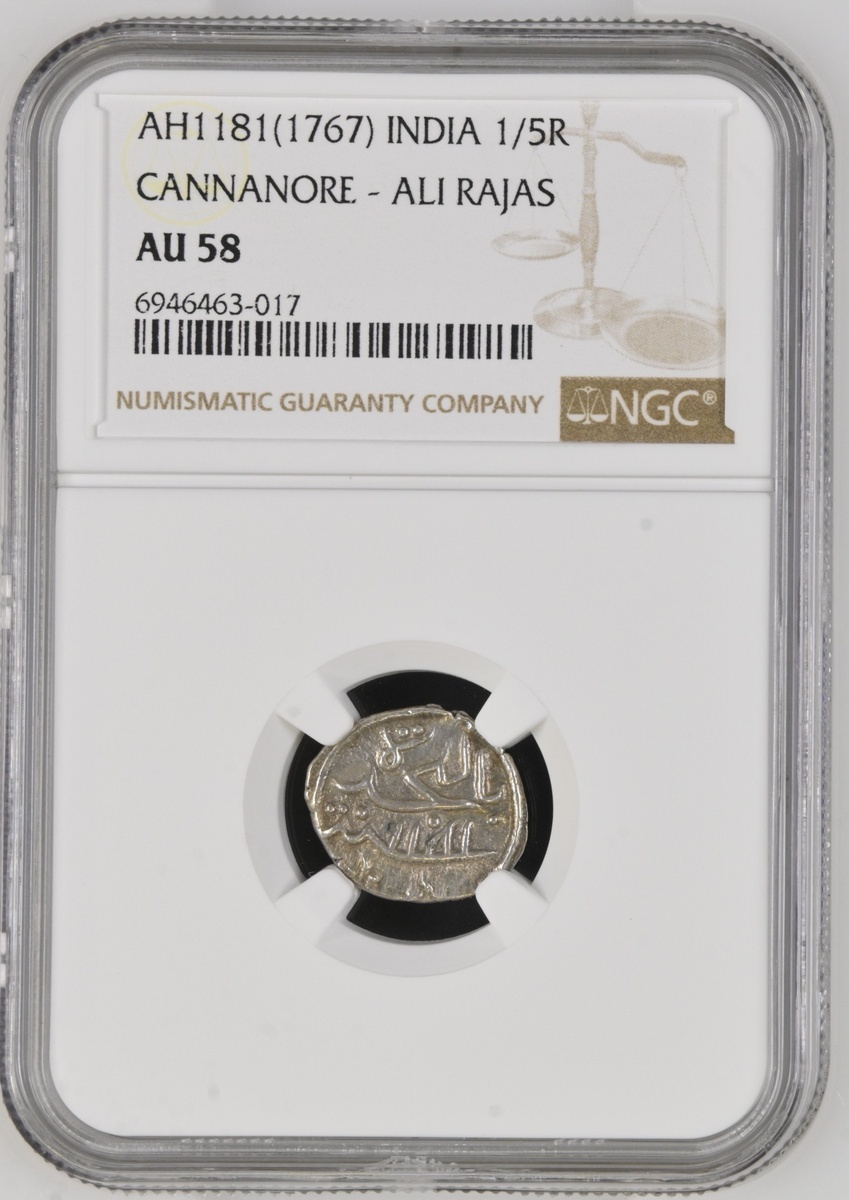 NGC AU58 | South India, Cannanore, Ali Rajas (AH 1122-1231/1710-1810 AD), 1/5-Rupee, 2.32g, AH1181, al-malik al-wali 'Ali Raja / bi al-bahr wa al-bar (Guardian of the Kingdom, 'Ali Raja, of the sea and the land) (KM 5), toned, about extremely fine, in NGC holder, graded AU58 (Cert. #6946463-017)