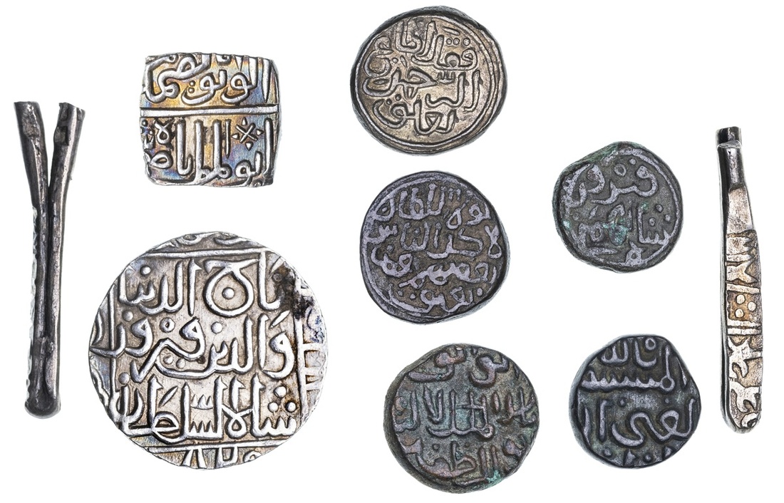 Indian Sultanates, Delhi, Token Currency, AE Half-Tankas (2), both dated AH730, the second with legend variant instructing users to obey Allah, the prophet and those in authority (from Qur'an IV, 62) (G & G. D 410, 411), good very fine, fine, scarce; Malwa, Nasir Shah (1500-1510), square Half-Tanka (G & G. M 110), extremely fine; Bahmani of the Deccan, Taj al-Din Firuz (1397-1422), Tanka, Ahsanabad, AH820, AE Falus, Ahsanabad; Ahmad Shah II (1435-57), AE 1/3-Gani (G & G. BH 63, 66, 87, 88), about very fine to good very fine; Bijapur, 'Ali 'Adil Shah (1656-1672), Larins (2), (Sultan) 'Ali 'Adil Shah / darb lari dabuli sanah (1071), one with date partially visible (G & G. BJ 37), very fine (9)